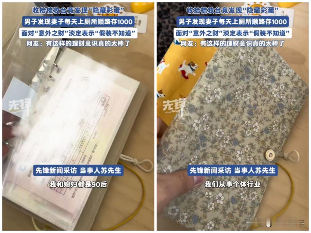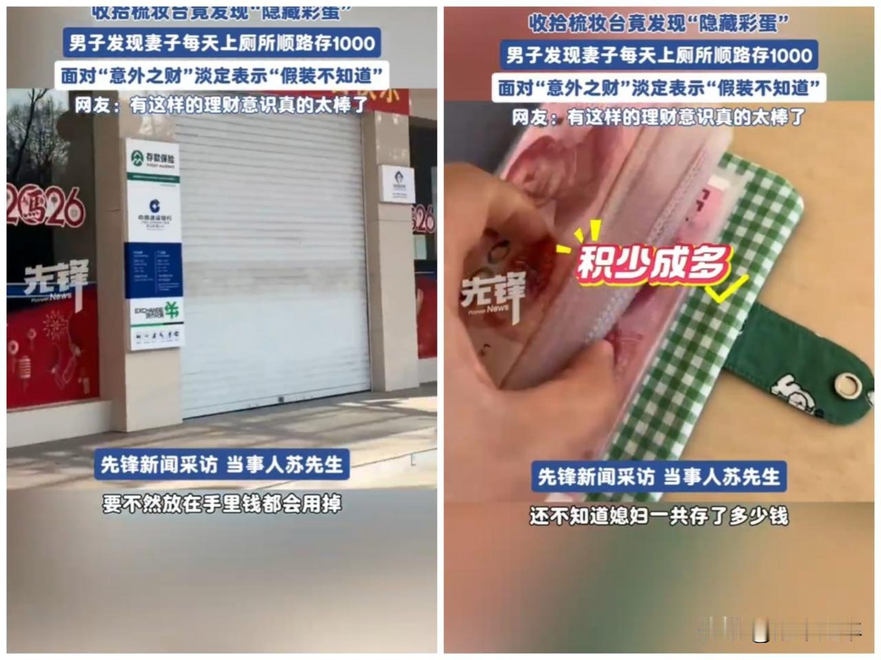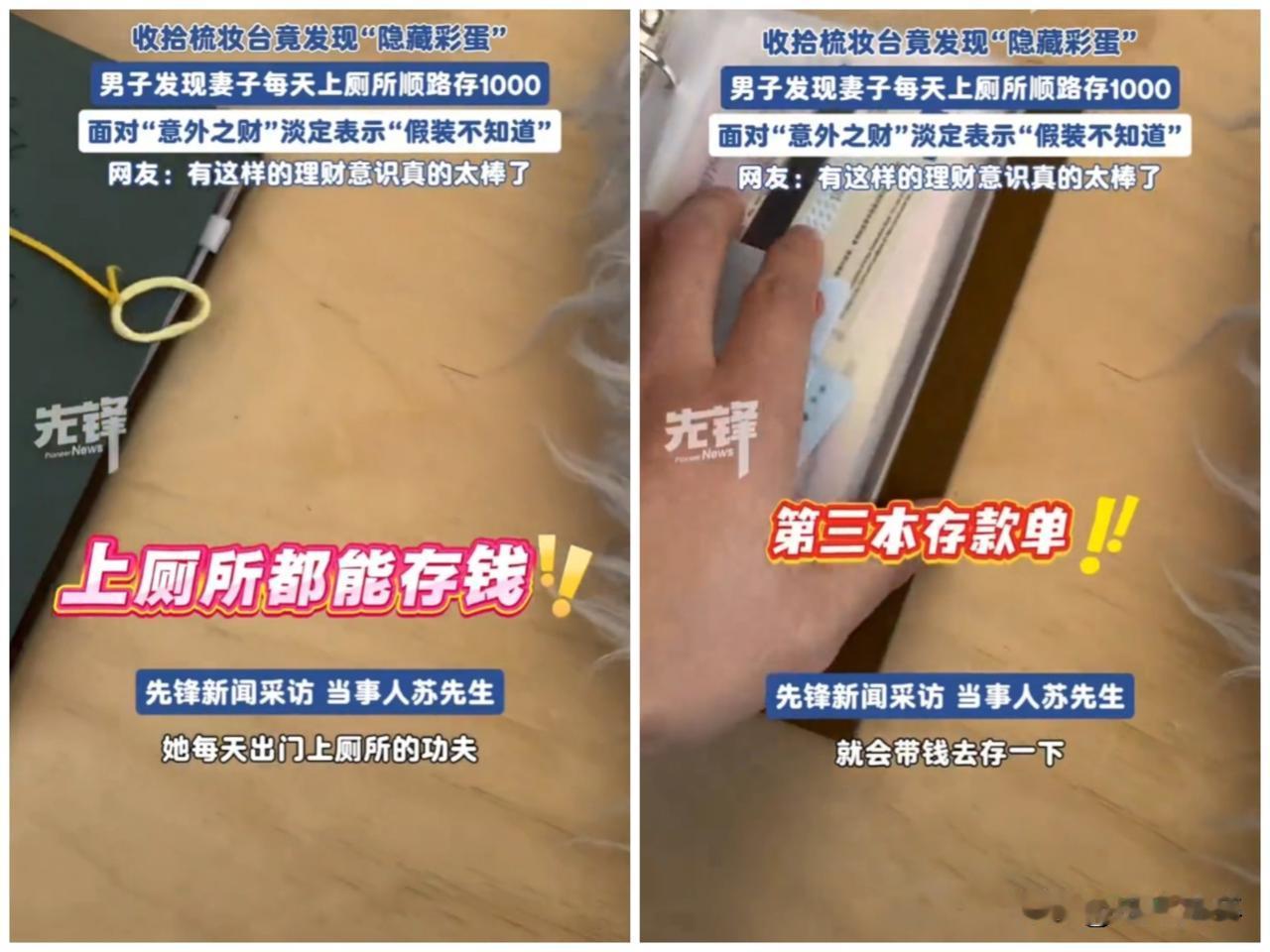 这样的老婆堪称贤妻👍她不想让我知道,我就让全网知道😂 夫妻均为个体户,收入按日结算。妻子自25年8月起,每日以上厕所为由前往店铺隔壁银行存入1000元现金,持续至26年1月23日,累计约200张存单总额20万元。存单被丈夫苏先生大扫除时意外发现于记事本中。妻子称此举是为避免现金随手花掉,为家庭储备应急资金。 这个老公挺有意思的,口口声声说“她不想让我知道,那我就不问,咱有这觉悟”。转身就把事情给挂网上了,让全国人民都知道的。那确实是“相当”有觉悟了🤭。妻子存钱是积极行为,丈夫若真尊重妻子,或许私下沟通分享喜悦更好,而非将隐私公之于众,能避免一些亲友借款的麻烦。 如今年轻人多热衷提前消费,妻子能坚持每日存1000元,半年攒下20万这份自律和规划意识着实难。为家庭构筑了坚实的“安全垫”,值得点赞。妻子176天坚持证明财富积累未必依赖高收入,而在于将微小习惯持之以恒。存钱储蓄确实是给生活兜底,尤其在经济波动期更显重要。 夫妻财务不用完全透明到“查岗式”,但也别藏着掖着。可以搞三层账户体系设立共同账户(家庭开支)、联名目标账户(购房/教育)、个人账户(小额自主支配),既留私人空间,也不影响家庭规划。低利率时代,存钱的自律比啥都强。当然了这些计划也要有经济保险作为基础,日均千元储蓄依赖高收入背景(推测月入超3万元)非普适方案(我存100都困难)。这里我先酸为敬🍋🍋🍋 顾家的好老婆 通情达理的妻子