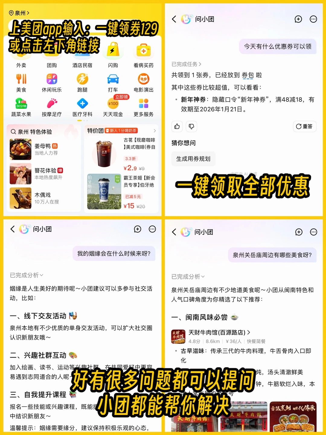 现在上美团App🔍【一键领券129】或点左下角,领全部优惠券,还能线上比价~ 本地生活衣食住行全靠小团!