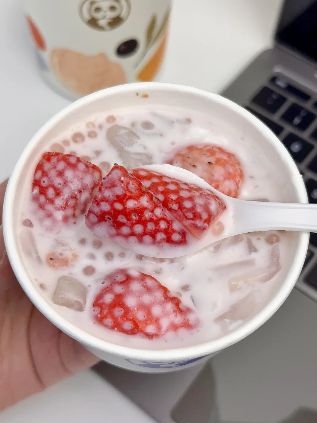 新鲜草莓果肉饱满,混着酸奶和奶盖的底,酸甜又清爽~