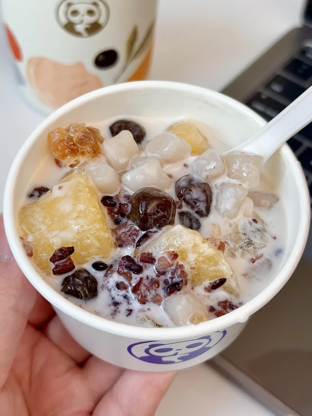 奶麻薯软fufu裹着奶冻,滑嫩到抿一口就化!!小西米入口Q弹,搭配浓郁的芝士奶盖,口感层次拉满,来上一勺,那种“甜品级”的清新感瞬间上头~