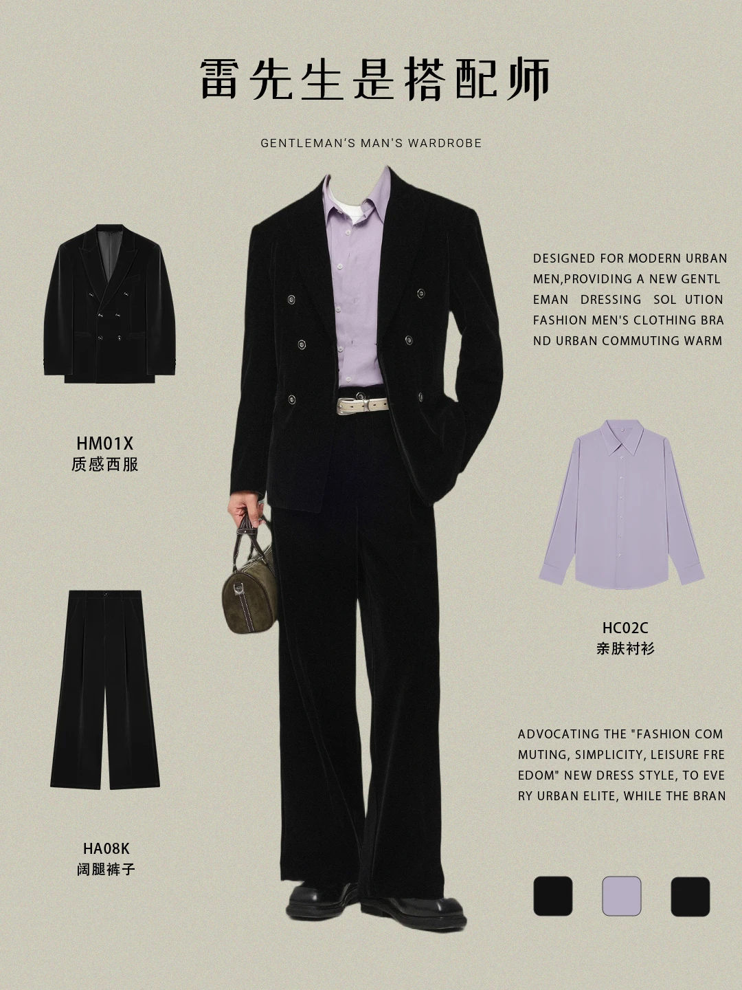 穿搭解析: 如果是晚宴婚礼或酒店内场(灯光较暗),黑色丝绒就是“吸光黑洞”,神秘又迷人。 不同于普通黑西装的沉闷,丝绒的黑色是五彩斑斓的黑,灯光一打,质感无敌。 ✨点睛之笔: 这里的内搭很大胆!选择了一件淡紫色衬衫。紫色本身就代表着浪漫与高贵,与黑色丝绒碰撞,打破了传统黑白配的单调,透露出一股“懂穿”的时髦品味,非常适合作为敬酒服或After Party的战袍。