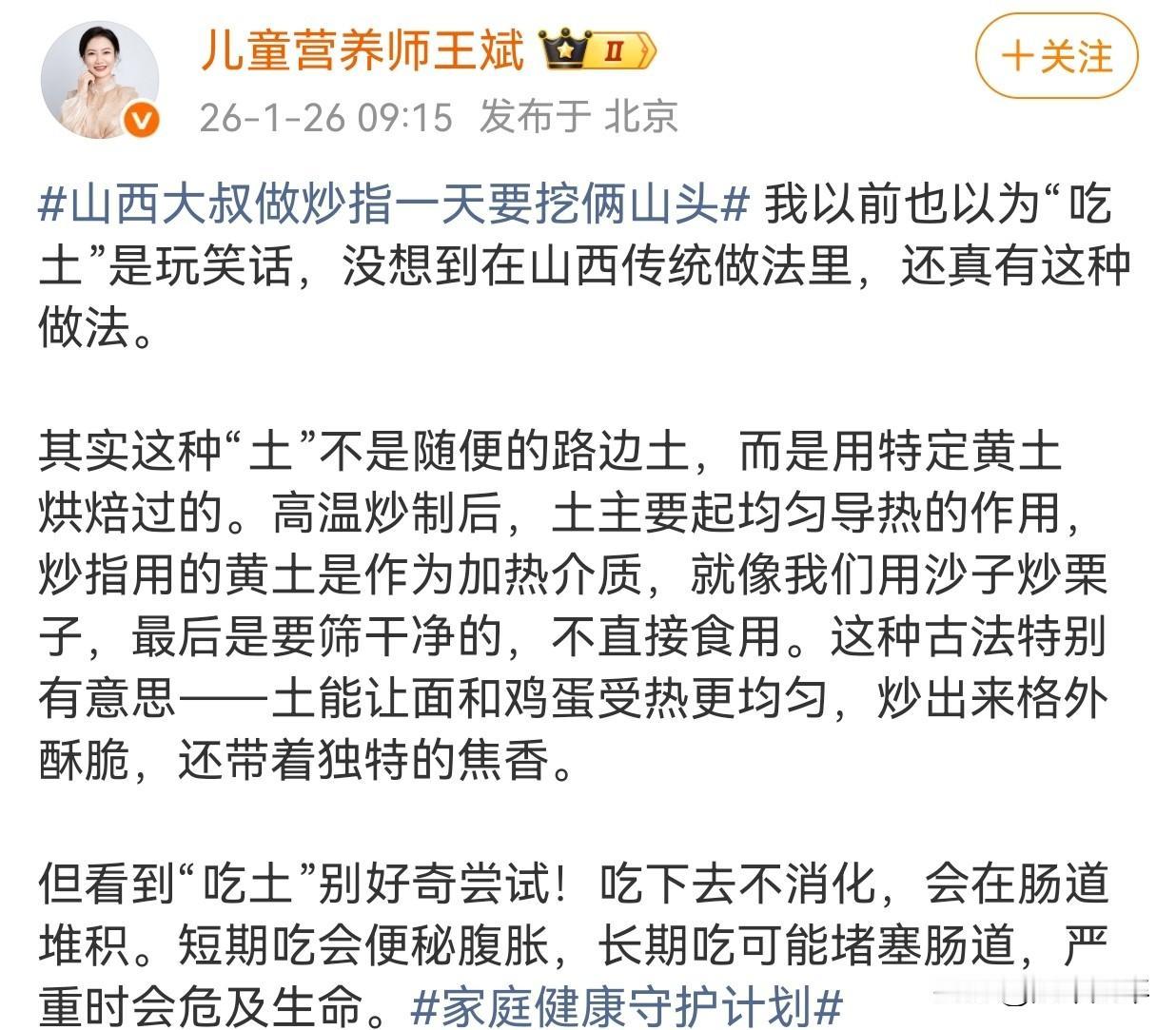 山西武乡非遗产品炒指制作过程让人惊讶😲 山西武乡千年非遗传统美食“炒指”。原料使用自养土鸡蛋,十斤面粉需配二十颗鸡蛋,在加上特定黄土为传热介质进行烹饪。制作时需精选太行山中层黄土,经2-3遍精细筛选确保洁净无杂质,这种土质富含矿物质且受热均匀,在200℃高温下呈现“火山喷发”状流体特性,此时投入手指状面坯快速翻炒,使面食受热膨胀定型。 炒指的制作历史可追溯到了至西晋军粮,此技艺有1700年历史,从西晋军粮演变为山西武乡非遗。其制作过程是民间智慧的大成,用土作为加热介质炒面,这是一种生存策略。在水资源丰富的地方,通常用煮和蒸来处理食物。在水资源匮乏的地方,通常就要用烤了但是,用烤有个先决条件,需要大量高质量燃料,如果没有怎么办,就把锅里的水变成土。是一种解决水和高质量燃料短缺的烹饪办法。成品分原味、甜味、咸味三种,口感酥脆带麦香与蛋香,咀嚼后泛起淡甜。当地人视“土腥味”为风味核心。 虽然是美食也该注意自身的健康安全,营养学专家指出,残留土颗粒含硅酸盐可能导致便秘或肠梗阻,提醒勿好奇尝试直接食土。现代工艺中,黄土仅作为导热介质而非直接食用成分,正确制作的炒指表面浮土已筛净。