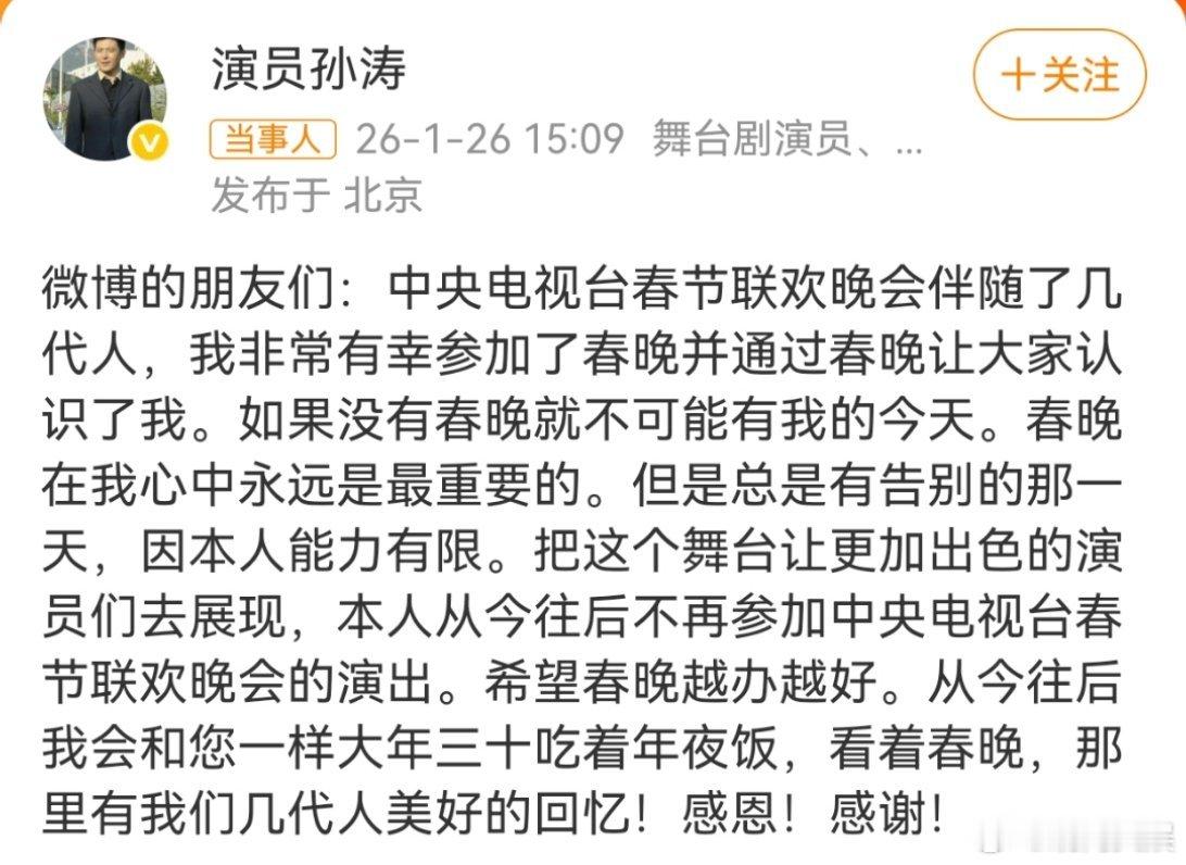 演员孙涛宣布告别春晚1月26日,宣布告别春晚,他称:我非常有幸参加了春晚并通过春晚让大家认识了我。如果没有春晚就不可能有我的今天。春晚在我心中永远是最重要的。但是总是有告别的那一天,因本人能力有限。把这个舞台让更加出色的演员们去展现,本人从今往后不再参加中央电视台春节联欢晚会的演出。希望春晚越办越好。此前孙涛在1月23日发布辟谣“直播力挺闫学晶”视频时称,闫学晶事件发生后,网上一些营销号造谣他“力挺闫学晶”“直播带货”“上春晚”等,他发布视频进行澄清,表示从未在网上说过“闫学晶”相关言论,自己也从未进行直播带货,他已经4年没上春晚了,今年春晚剧组确实找过他,但他认为今年没有准备好好的节目就拒绝了。