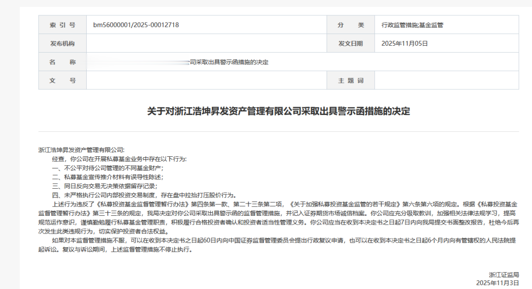 中国证券投资基金业协会公示信息显示,浩坤昇发成立于2016年6月,于2017年11月完成登记,目前管理规模在20亿元—50亿元区间。2025年11月,浙江证监局披露信息称,浙江浩坤昇发存在四类违规事实:一是不公平对待公司管理的不同基金财产;二是私募基金宣传推介材料有误导性陈述;三是同日反向交易无决策依据留存记录;四是未严格执行公司内部投资交易制度,存在盘中拉抬打压股价行为。