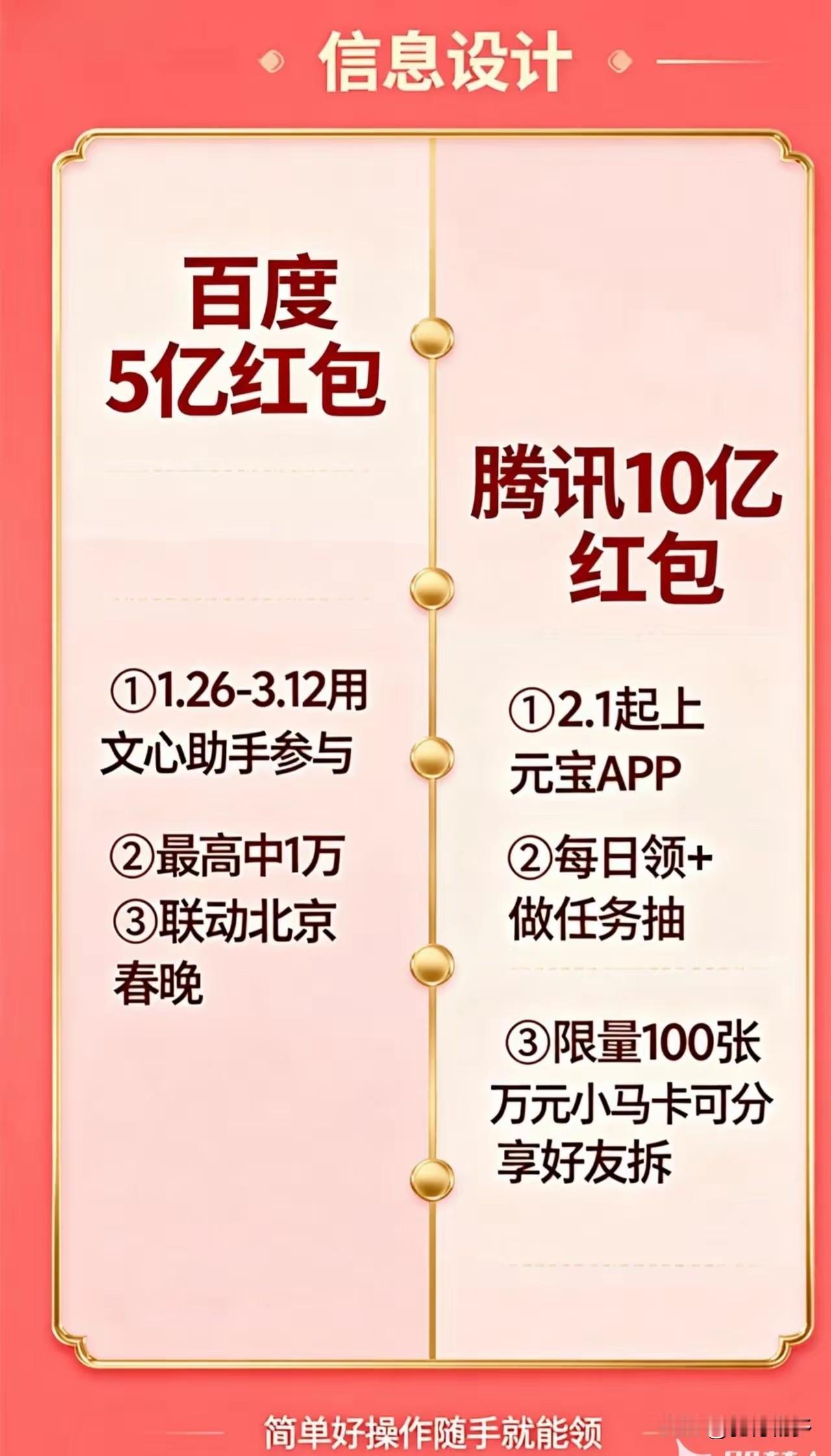 腾讯元宝发40亿红包!百度文心助手发5亿红包!快过年了,各平台都开始发红包了。