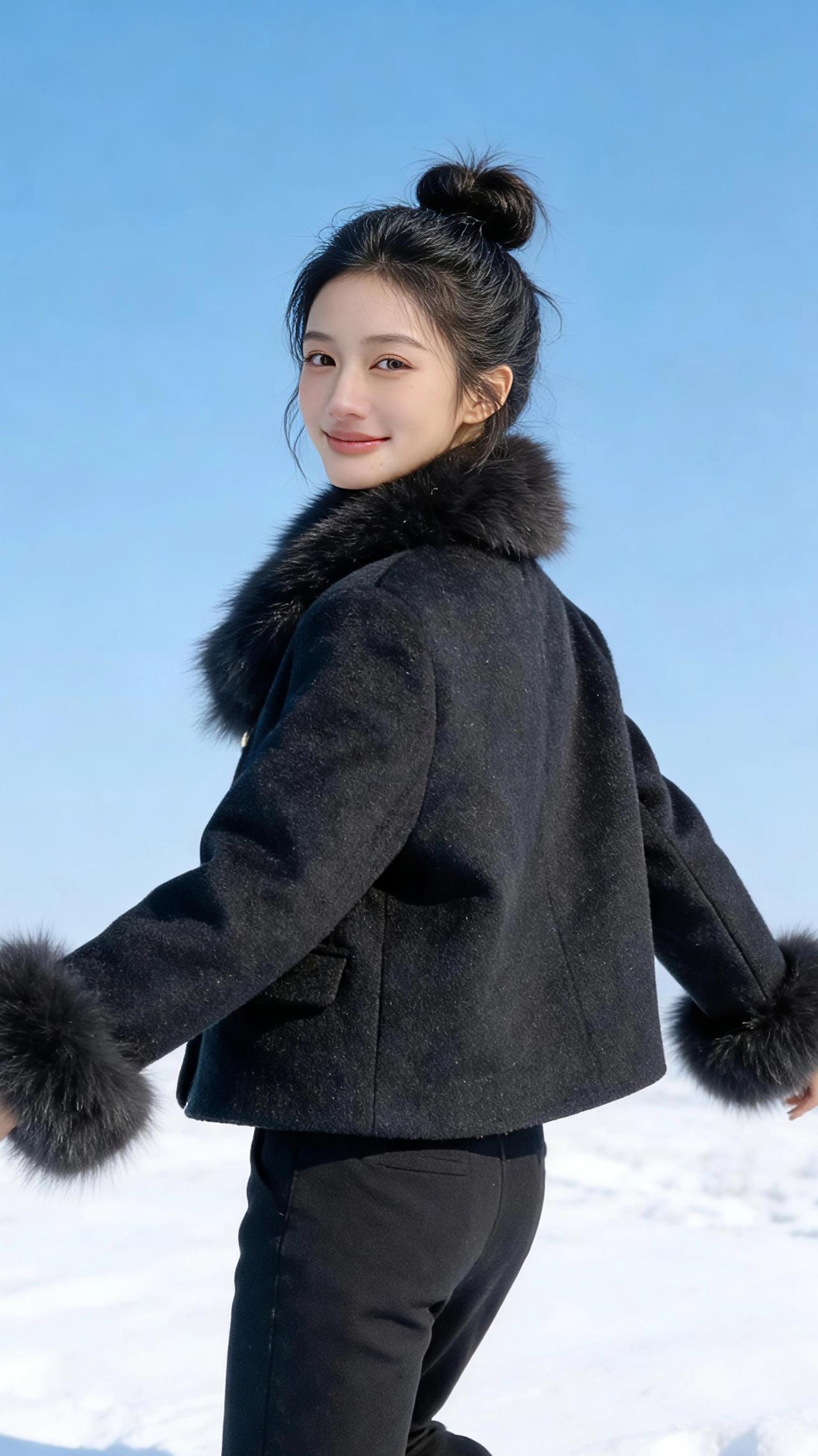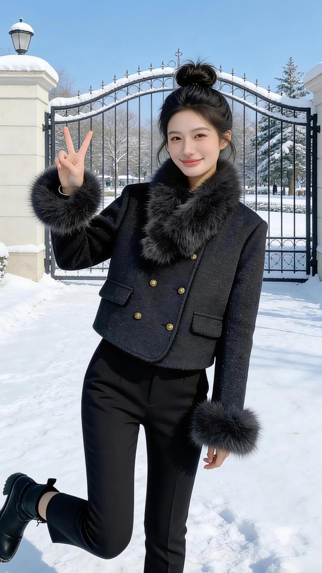 雪地里的黑绒序章 雪把天地滤成干净的蓝,风掠过发梢时,我正踩着碎琼乱玉往前走。 黑色短外套上的毛领,是寒日里最温柔的注脚,绒毛在风里轻轻晃,像把细碎的星光都收进了领间。袖口的狐毛蓬松柔软,垂落时扫过雪地,在白得晃眼的世界里,晕开一小团暖。 转身的瞬间,阳光撞在毛领上,泛出细密的绒光。我把手揣进外套口袋,任雪粒子在裤脚轻轻弹跳,身后是覆雪的铁艺拱门,线条在素白里描着精致的弧。 跑起来时,风灌进衣领,毛领却稳稳兜住了暖意。我对着镜头比出“V”字,靴底碾过积雪的轻响,和笑声一起碎在风里。黑与白在视野里交织,毛领的暖,裤脚的轻,都成了这冬日里鲜活的注脚。 原来最冷的天,也可以用一身利落的黑,穿成一首温柔的诗。 高级感穿搭 冬季穿搭 新年穿搭 小个子穿搭