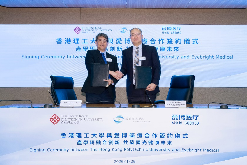 双方亦将通过技术验证与应用试点,借助爱博医疗商业化能力与市场化运营能力,加速科研成果落地,实现创新技术与产业需求的有效衔接。爱博医疗设有眼科视光奖学金,可提供科研实践、实习岗位;香港理工大学具有人才培养、国际视野、全球资源等优势,双方共建联合培养机制,可实现人才成长与产业发展的精准匹配。同时,爱博医疗还将和香港理工大学初创企业瞳研科技有限公司共同探索近视控制前沿科技,助力大学科研成果产业化落地。