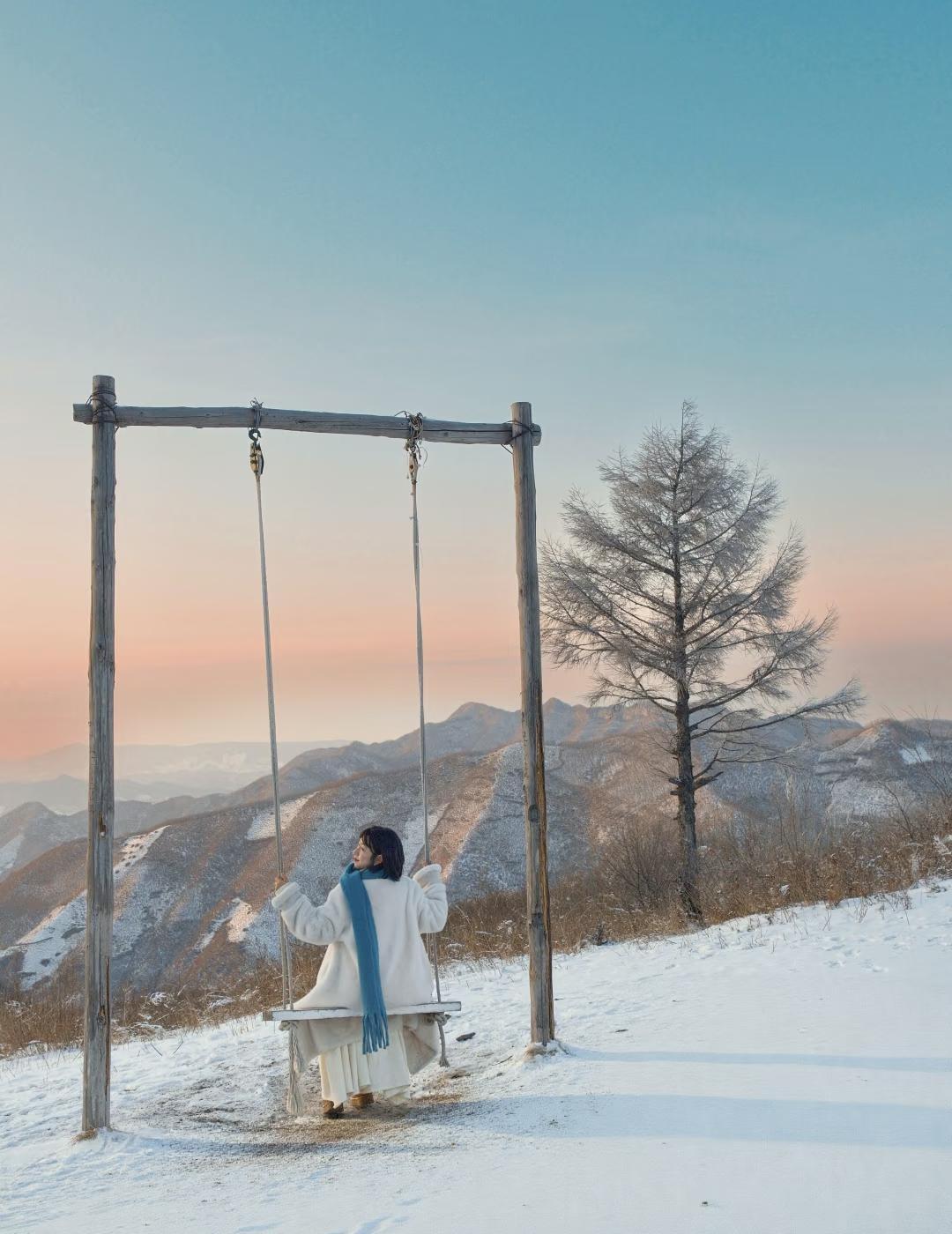 沈阳周边游|山顶,日落,秋千 位置:辽阳梨花峪 穿搭建议:白色➕彩色配饰 拍照 | 游玩tips: ▪️拍照机位:山顶秋千 | 森林 | 孤独的树 | 村庄 ▪️导航「梨花峪村」沿主路行驶往山上开,雪天路滑建议把车停在空地,徒步上山,大概1h左右能走到山顶秋千 ▪️建议下午两点上山,能看到超美的日落晚霞,还有蓝调时刻,然后赶紧下山,天黑路不好走 浪漫生活的记录者 雪一落就美成了诗 笔记灵感 周末去哪儿 辽宁美好推荐官 山顶看日落 沈阳周边游 东北旅游 走进冬日山野