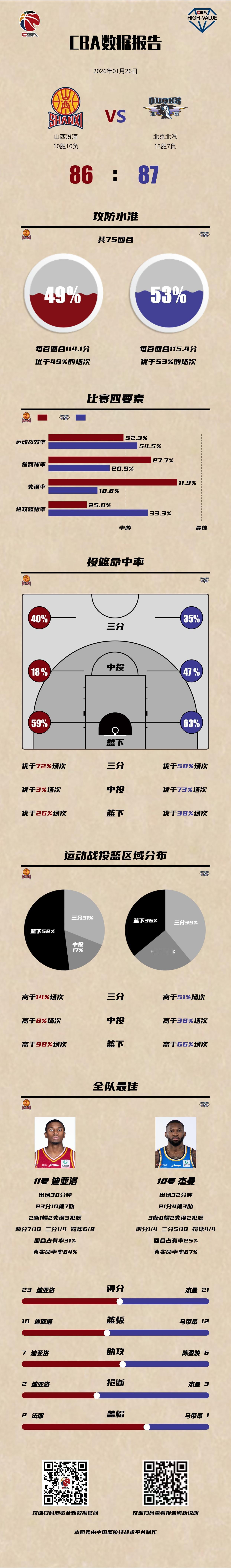 山西汾酒 86-87 北京北汽山西男篮vs北京男篮 山西汾酒:迪亚洛23分10篮板7助攻2抢断,刘传兴16分5篮板,奈特11分; 北京北汽:杰曼21分4篮板3助攻3抢断,雷蒙15分6篮板,陈盈骏14分4篮板6助攻。CBA数据库