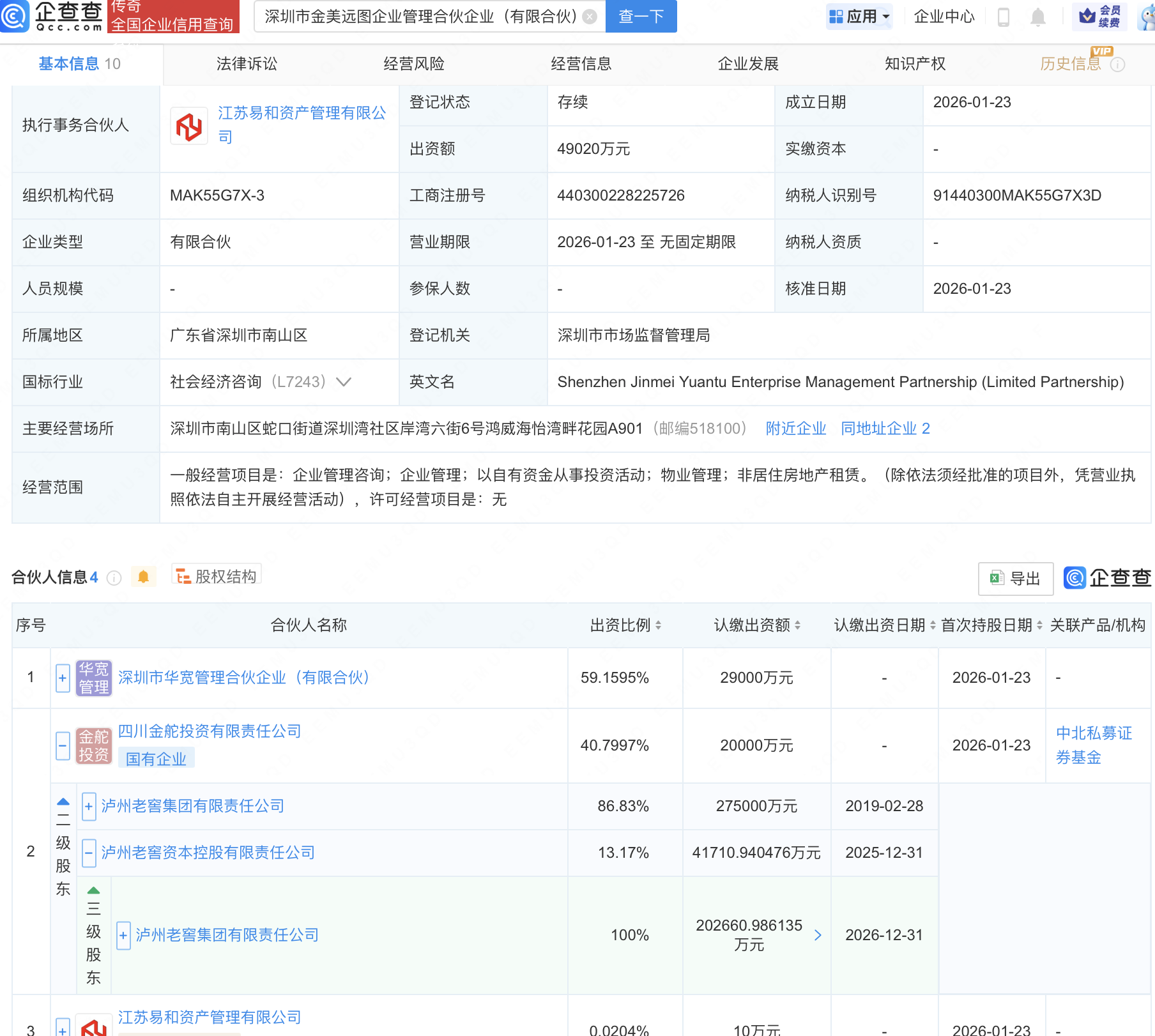 企查查APP显示,近日,深圳市金美远图企业管理合伙企业(有限合伙)成立,出资额4.9亿元,经营范围包含:企业管理咨询;企业管理;以自有资金从事投资活动;物业管理;非居住房地产租赁。企查查股权穿透显示,该企业由泸州老窖集团有限责任公司旗下四川金舵投资有限责任公司等共同出资。