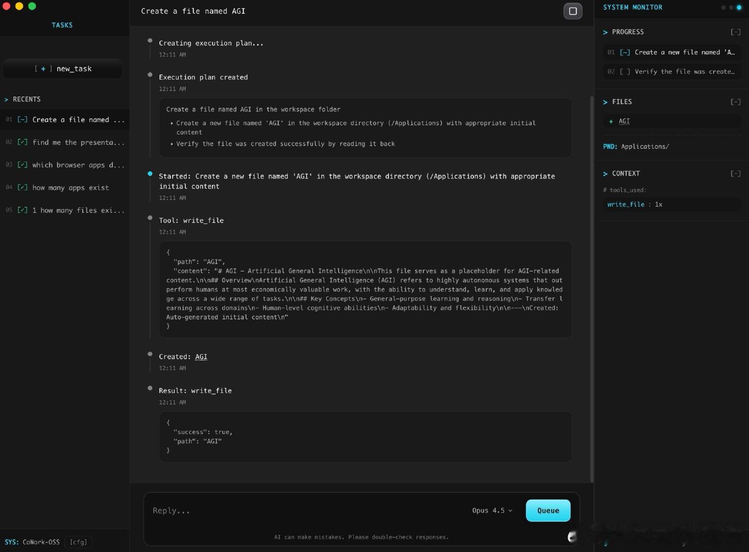 【本地优先的AI代理工作台,让你掌控一切】最近发现了一个值得关注的开源项目CoWork-OSS,它重新定义了AI代理与本地文件系统的交互方式。传统的AI助手要么完全云端运行,要么缺乏对本地文件的精细控制。CoWork-OSS走了一条不同的路:它是一个本地优先的代理工作台,专门处理文件夹范围内的多步骤任务,同时保持用户对所有关键操作的审批权。这个项目最吸引我的几个设计理念:+ 自带密钥模式的透明性支持Anthropic、Google Gemini、OpenRouter、AWS Bedrock等主流服务商,也可以用Ollama完全本地运行。你的API费用直接付给服务商,项目本身不做任何代理或转售。这种设计既保护了用户隐私,又避免了中间商赚差价的问题。+ 工作区沙盒与权限守门所有文件操作都被限制在你选定的文件夹内,路径穿越尝试会被直接拒绝。更重要的是,删除文件、执行shell命令、批量重命名等敏感操作必须经过用户明确审批。这种设计承认了一个现实:AI系统可能产生意外行为,但最终决定权应该留给人类。+ 内置专业文档技能可以直接生成Excel电子表格、Word文档、PDF、PowerPoint演示文稿,支持多工作表、自动列宽、格式化等高级功能。对于需要从数据到报告的完整工作流来说,这省去了大量手动整理的时间。+ 实时透明的执行过程终端风格的界面会实时展示代理的每一步计划、工具调用和决策过程。你可以清楚看到AI在做什么、为什么这样做,而不是面对一个黑盒等待最终结果。项目还集成了Telegram和Discord机器人,支持多源网络搜索,甚至有Playwright浏览器自动化能力。路线图上还有虚拟机沙盒、MCP连接器、子代理协调等更进阶的功能。一个值得思考的问题:当AI代理越来越强大,能够自主完成复杂任务时,如何设计合理的人机协作边界?CoWork-OSS给出的答案是:让用户选择信任范围,在关键节点保留否决权,同时确保整个过程可观察可追溯。这或许是未来AI工具的一个重要设计范式。github.com/mesutfelat/cowork-oss
