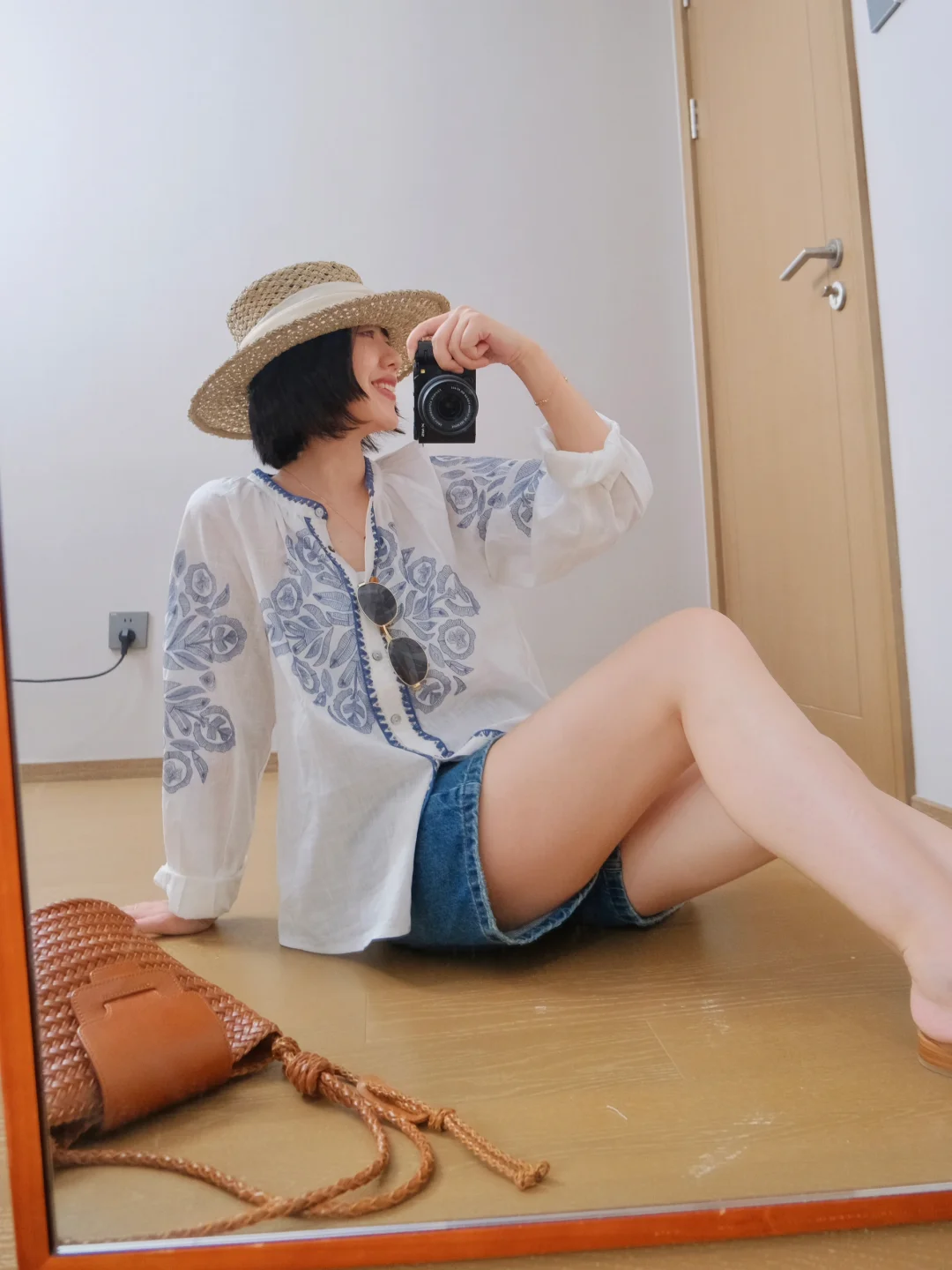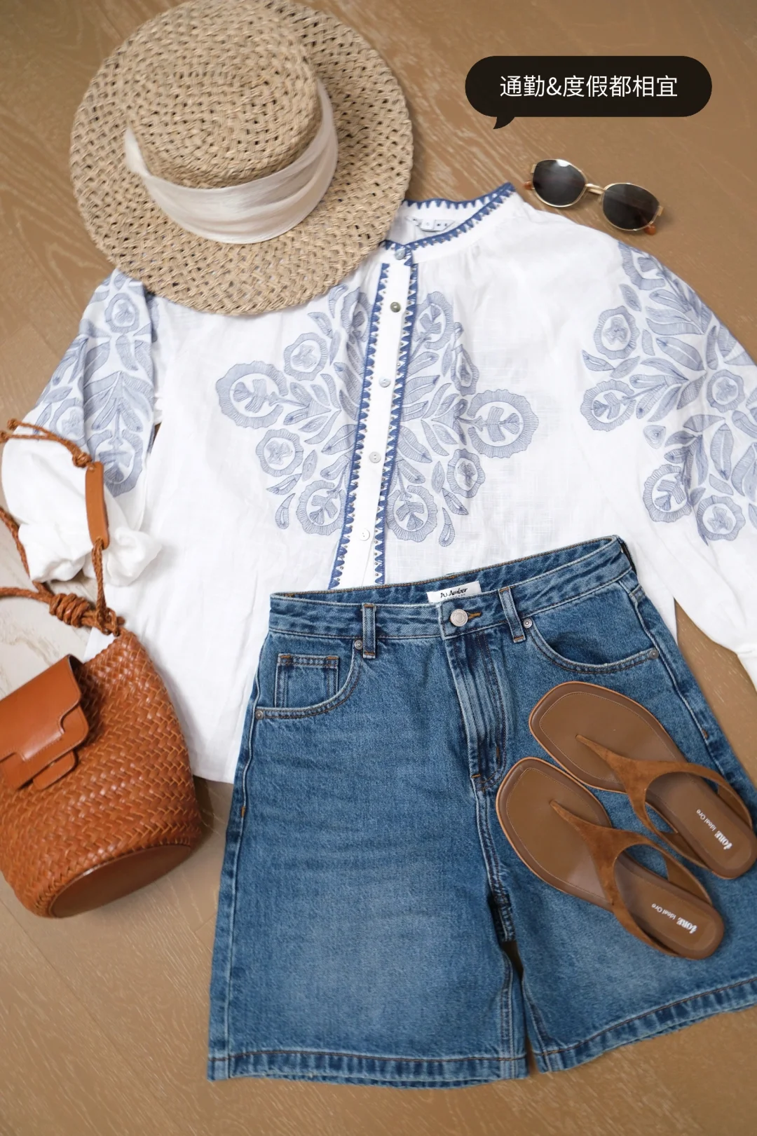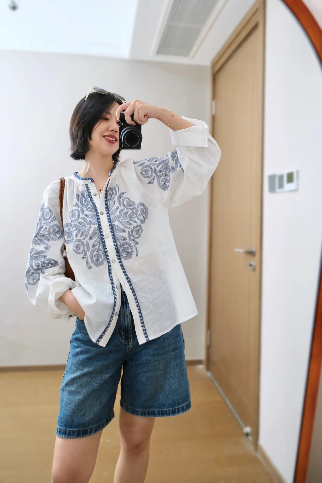 法式花花衬衫 有点青花瓷的feel 搭配牛仔中裤 上班&度假两相宜
