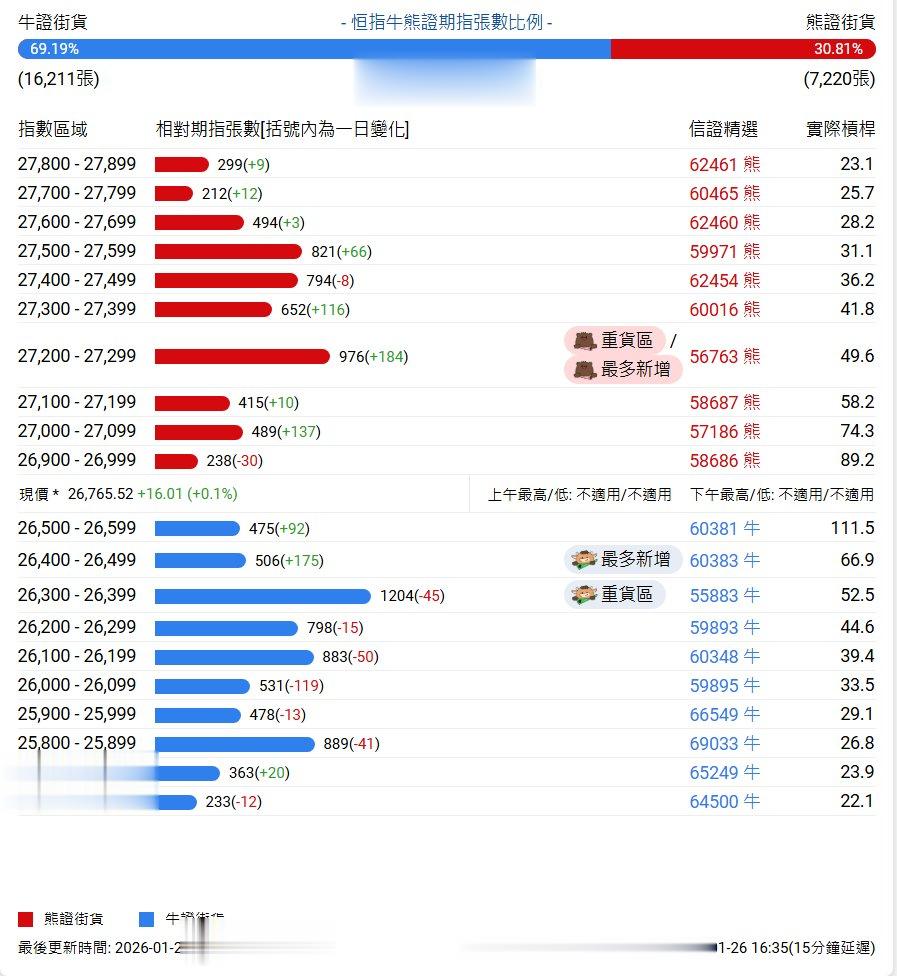 牛证街货重货区在26300-26399区间,该区间最新牛证数量为1204张,较上一交易日减少45张;最多新增在26400-26499区间,该区间最新牛证数量为506张,较上一交易日增加175张。