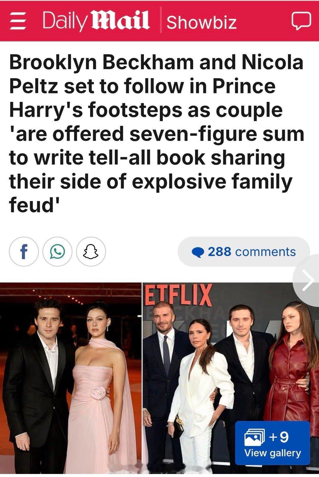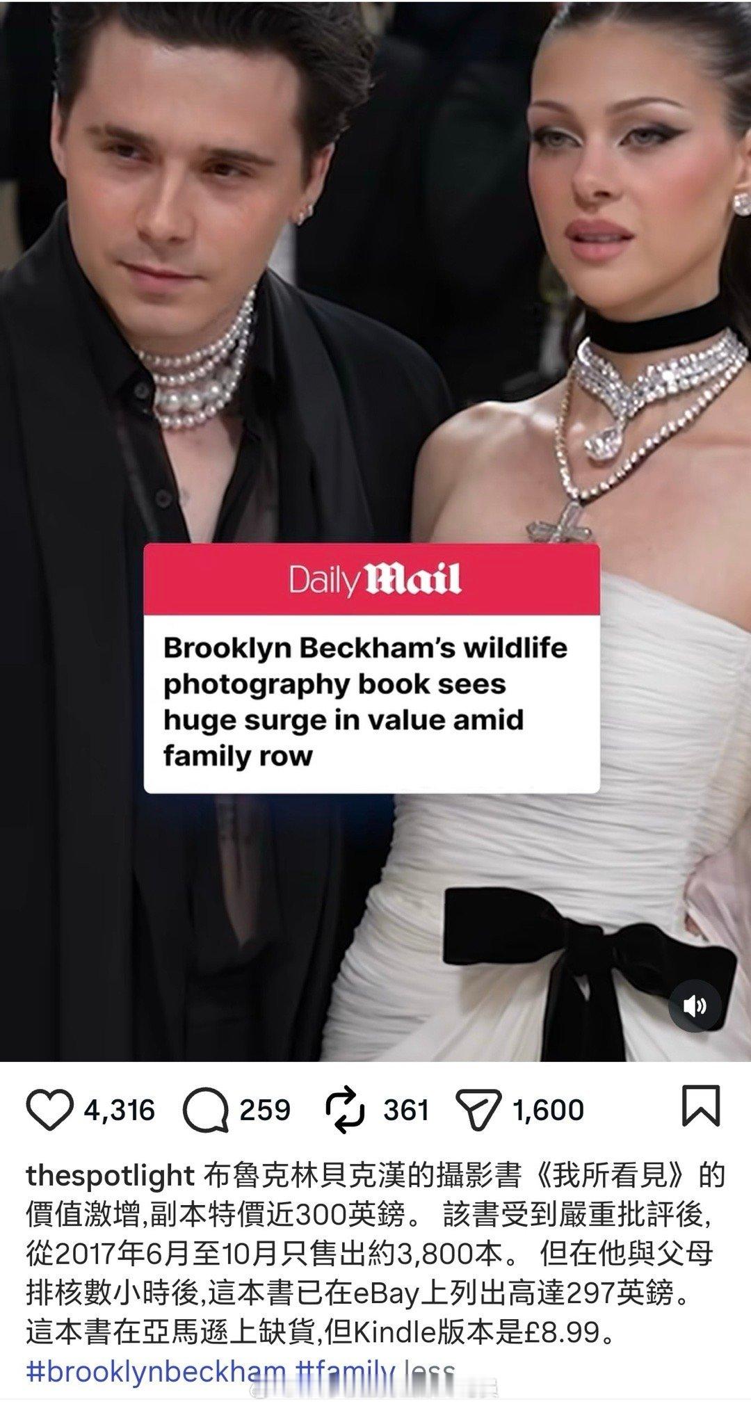 据《每日邮报》报道:布鲁克林·贝克汉姆和妮可拉有望成为继哈里王子之后的又一对“热门情侣”。据悉,他们被开出高达七位数的报酬,要求撰写一本揭秘他们家族激烈矛盾的独家实录书。鉴于布鲁克林的摄影书《我所看见》价值激增,同款副本售价接近300英镑。该书遭受严厉批评后,2017年6月至10月仅售出约3800本。但在他和父母矛盾公开后,这本书在eBay上的标价已高达297英镑。该书在亚马逊上处于缺货状态,不过Kindle电子版售价为8.99英镑。(