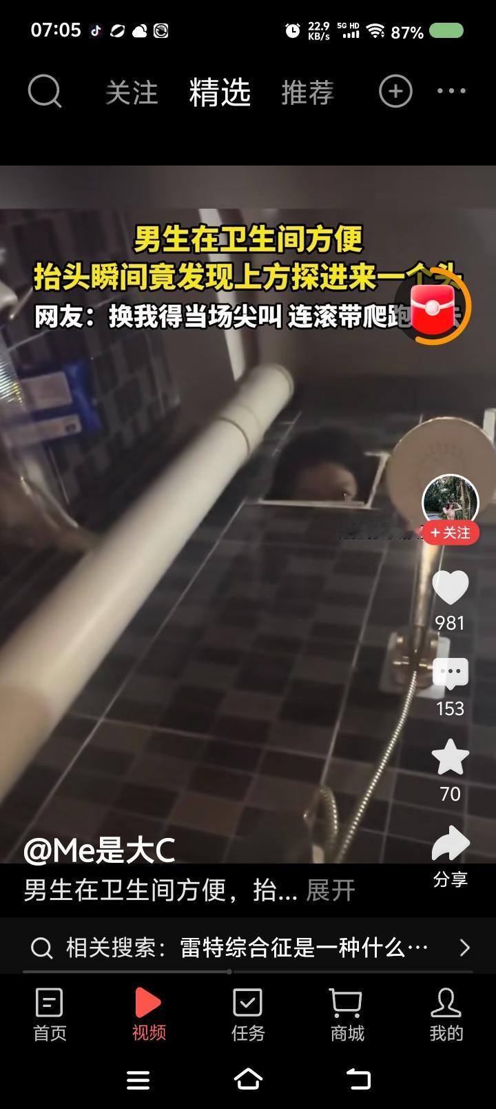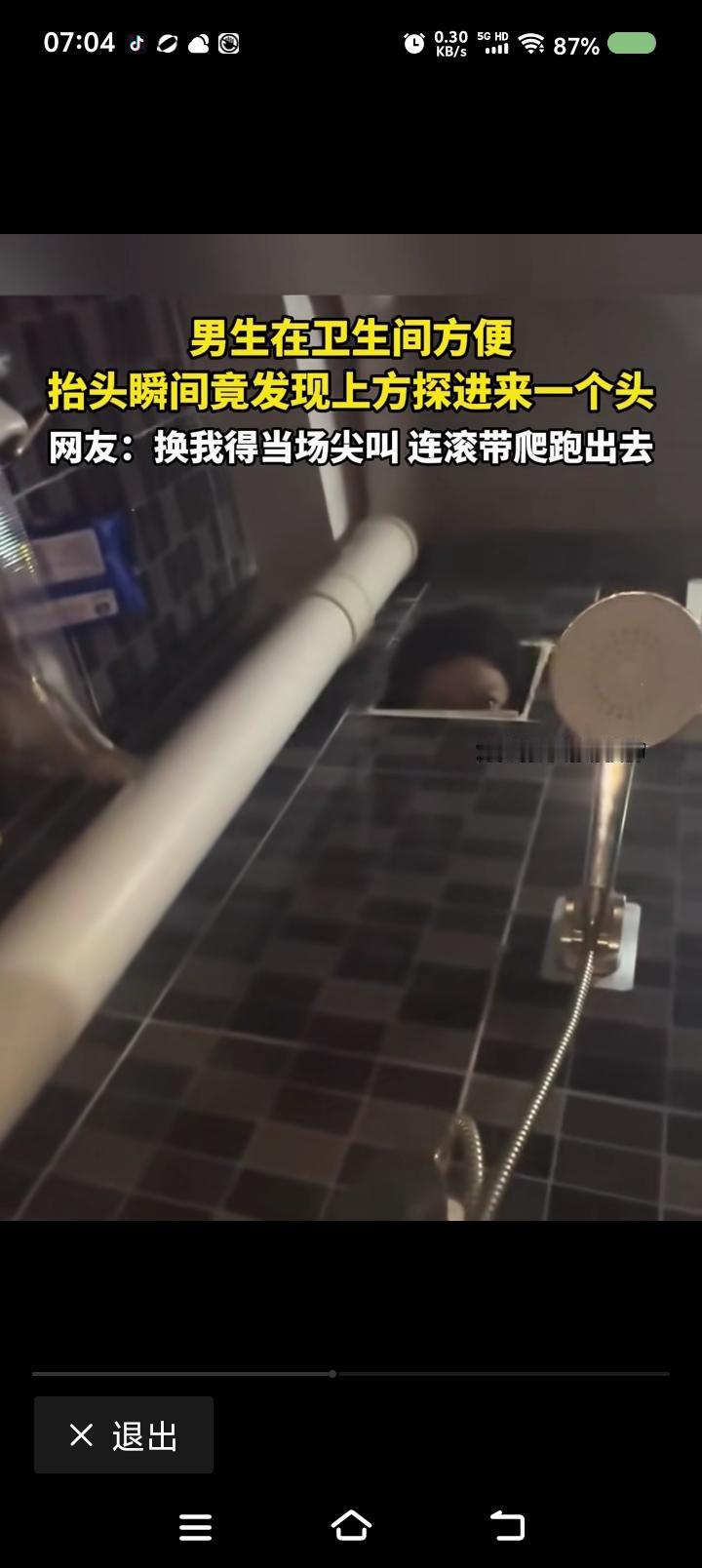 上厕所被吓到了?—— 网上视频:一男子上厕所,抬头发现上方进来一个人头,那人看了一会。男子吓得跑出去。 点评: 建议有关部门调查。 首先查此视频是否真实,如果是假的,依法处理。 如果是真的,那得追责。那个人为什么伸头窥视?那眼神很吓人,明显故意。