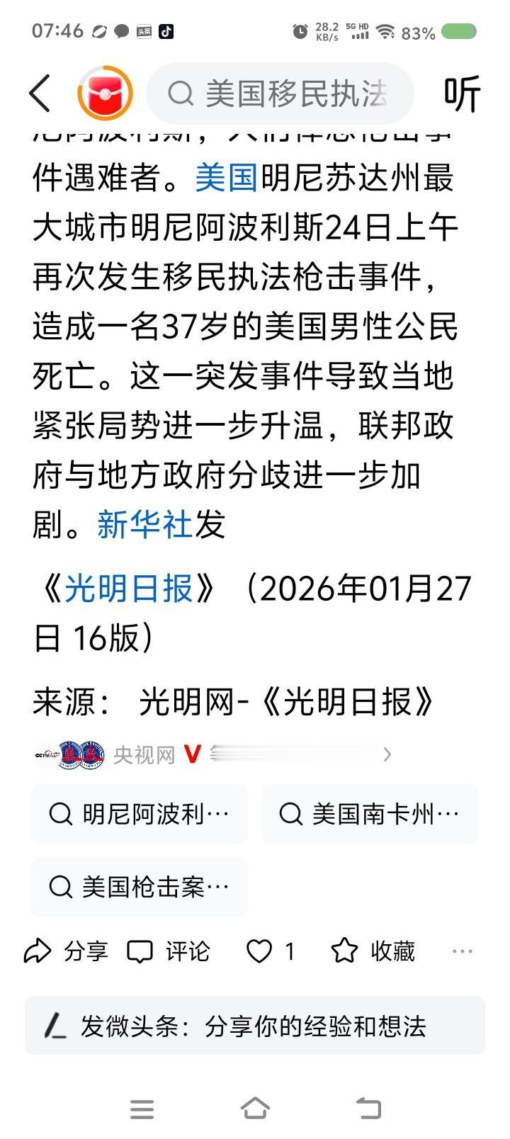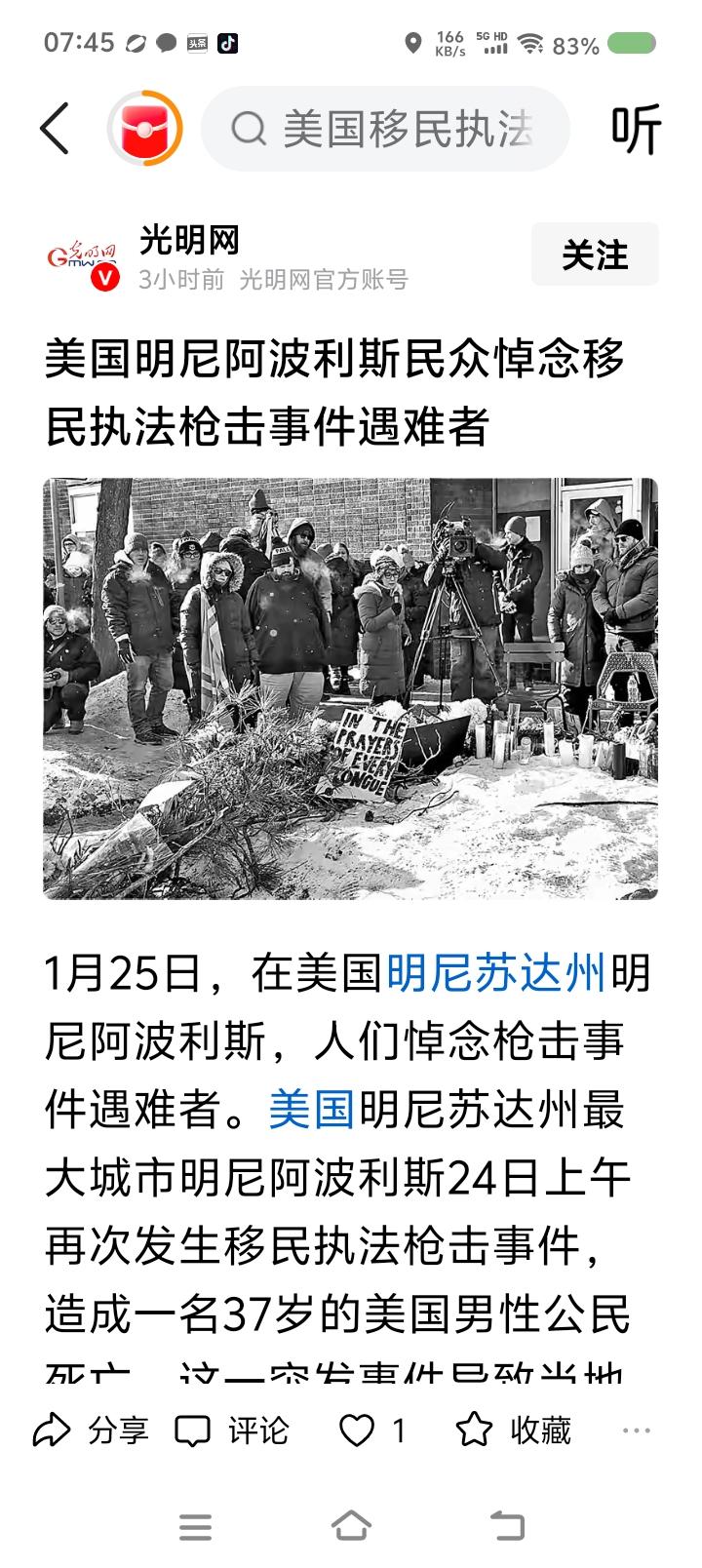 美国到了最危险的时刻?—— 近日,美国移民局(ICE)到一些州抓捕所谓的非法移民,枪杀了多名美国人。引发百姓大规模抗议。 副总统和国土安全部部长分别声明,为移民局特工辩护。 明尼阿波利斯市,警察局长、应急管理部门负责人、政府官员发言,观点不同。但没有有效的办法,制止这场冲突。 移民局抓非法移民,到了非常恐怖的程度:进社区,闯教堂,入学校,还利用孩子骗家长开门进而搜捕。 这些起冲突的州是不是民主党执政的州?如果是,这算不算区别执法? 悲哀的是,民主党的前总统及一些议员,只有空洞的抗议,话说得狠,实事一件也不干。哪怕让枪击特工走上被告席也好,进入司法程序这么难吗?很明显,特朗普、移民局想解决的不是非法移民,而是美国中下层民众。 也就是说,这是移民问题掩盖的阶级矛盾。 特朗普警告伊朗:“谁敢对我不利,美国把它从地球抹去。”同样,特朗普以此警告美国民众:“谁反对我,谁就是非法移民!” 一个想建精神病院计划把流浪汉关进去的总统,你指望他解决移民问题?他有病还是你可笑? 至于民主党,与共和党不是一丘之貉么?只是,前者说:“宰杀时放点音乐,我假装哭一哭。”当然,也不能说两个光没好人了,但在阶级利益面前,那点`品质与人性微不足道。 那美国人民怎么办? 中国网友早开出了药方:读毛主席的书,干起来!中国的课本上明明白白地讲了:法律,军队,警察,政府,监狱,等等,都是阶级统治的工具。社会主义国家,这些工具为人民服务,打击国内外敌人;资本主义国家,这些工具为谁服务?一目了然。为民众服务的部分,你数吧。在美国,地震了,火灾了,你家没米了,你房子塌了,你打个电话试试。 特朗普笑眯眯地看着你:“嫌我的业绩不够大?”