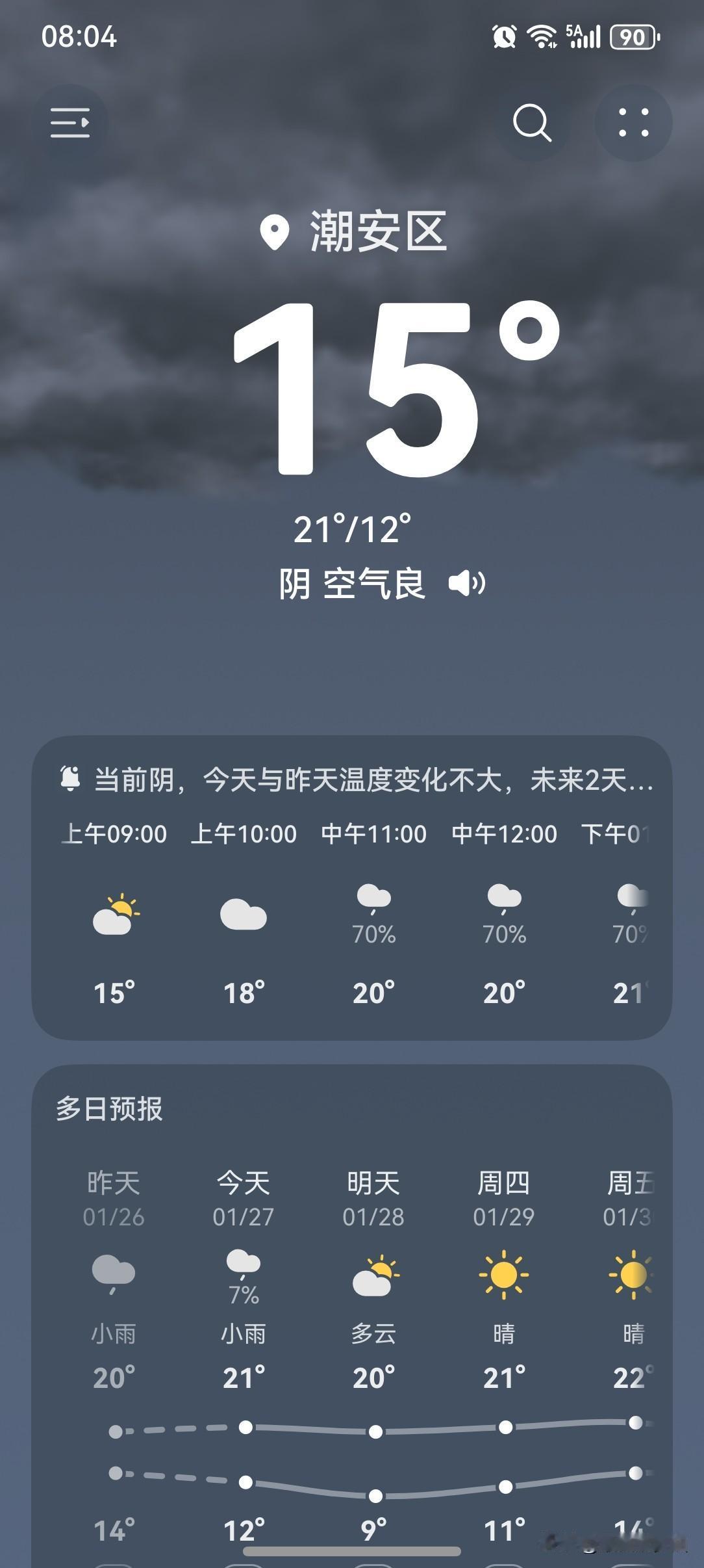广东刚暖和就有弱冷空气来拆台! 今天(27日),粤东、粤北、珠江三角洲南部市县有小雨,大部市县有轻雾或雾,雨雾天气能见度低;26日夜间~28日有新的一股弱冷空气影响,我省大部市县有2~4℃的过程累积降温。 今天(27日),潮州小雨转多云,气温12~21℃,此刻气温15℃,体感温度14℃,相对湿度90%。 一起来看看今天的天空吧!云量依然是有的多,但天色已经比昨天好很多了,雾也没有昨天那么严重,薄雾却依然存在。 再来看看气温方面!今天的气温还是比较高的,全天最高气温将上升至21℃,又是暖暖的一天。 看来弱冷空气对我们这边的影响不大呢!也可能是晚一点冷空气才能抵达,总之今天还是非常暖和的。 今天的天气,从整体来讲值得拥有一个好评!五星就没有了,因为空气潮湿,不大喜欢。 如此天气!元芳,你怎么看? [捂脸][笑哭][大笑][我想静静][捂脸][笑哭][大笑][我想静静]
