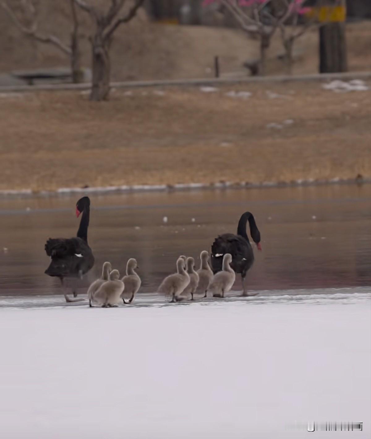 一张图证明冬天来了雪色冰面上,黑天鹅夫妇带着八只毛茸茸的宝宝列队前行,小团子们迈着细碎的步子紧紧跟随,像一串滚动的绒球。冬日的清冷里,这一家子“踏雪远征”的模样,把日子过成了一幅暖融融的画。