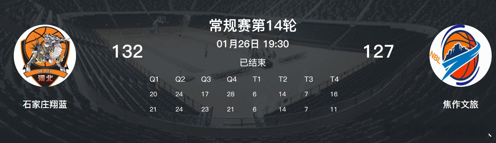 NBL联赛上演四加时 NBL常规赛第14轮,石家庄翔蓝与焦作文旅上演四加时苦战,最终翔蓝132-127取胜。全场比赛总耗时3小时15分钟,单场四个加时赛也创下了NBL联赛的历史纪录。翔蓝阵中热甫卡提江和霍恩打满全场60分钟(系统可能也没想到1小时的上场时间,显示00:00),热甫卡提江拿41分23板6助攻,霍恩39分21篮板。叫做文旅这边,威姆斯出战33分钟,拿到30分15篮板。