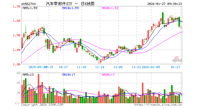 1月27日,汽车零部件ETF(562700)开盘跌0.51%,报1.550元。汽车零部件ETF(562700)重仓股方面,汇川技术开盘跌0.25%,三花智控涨0.10%,福耀玻璃涨1.12%,拓普集团跌0.18%,长盈精密涨0.56%,赛轮轮胎跌0.25%,德赛西威跌1.09%,双环传动跌0.38%,银轮股份跌0.25%,华域汽车跌0.10%。