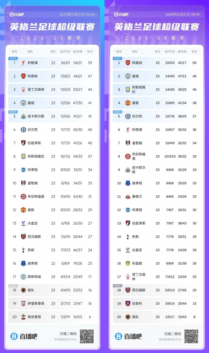 直播吧01月27日讯英超第23轮全部战罢,本轮利物浦2-3被伯恩茅斯绝杀,排名下滑到第6名。
