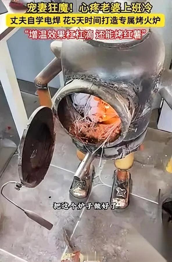 老公花5天做了个神器! 居然是用煤气罐改的? 辽宁朝阳这位大哥心疼老婆户外上班冷,硬是从零自学电焊,对着废旧煤气罐敲敲打打5天,鼓捣出个会发热的“专属烤火炉”。老婆说升温效果特别好,甚至还能烤红薯!这事乍一听挺糙,细品全是温柔——比起直接买取暖器,这种亲手打造的温度,藏着“我怕你冷,所以想为你做点什么”的笨拙真心。 其实婚姻里最动人的,从来不是多昂贵的礼物,而是有人愿意为你花时间、费心思。当钢筋铁骨的煤气罐变成冒热气的暖炉,当粗糙的电焊痕迹成为爱的纹路,这不就是普通人能触碰到的浪漫吗? 你家那位,有没有过这种“土味但走心”的暖心操作?快来聊聊!