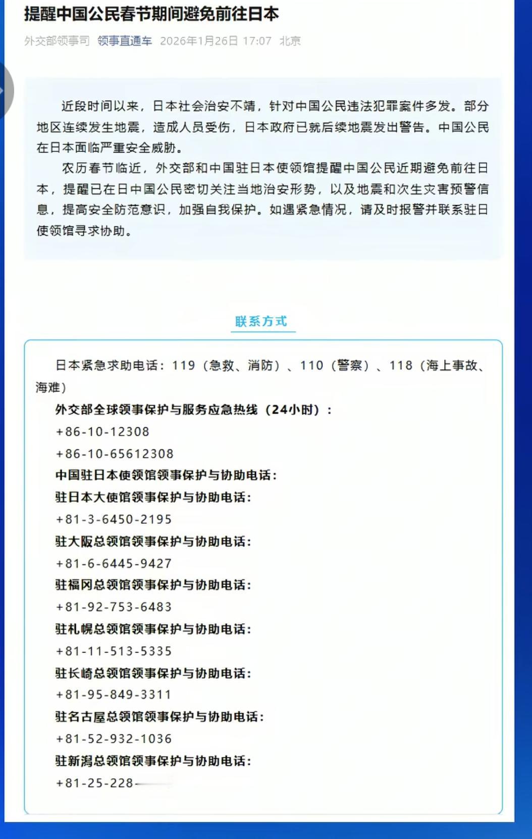 外交部发出提醒,农历春节将至,建议避免前往日本。此番提醒究竟是无病呻吟,还是有迹可循呢? 在这个时间节点,49条航班线纷纷取消,由此可见事态之严重。临近年关,日本社会治安渐趋混乱,违法犯罪案件增多,尤其是针对中国公民的案件。切莫将日本想象得过于美好,绝大多数日本人对中国仍持抵触情绪,针对中国人下手的情况也并非个例。 此外,每年一二月都是敏感时期,众议院面临大洗牌,各位政治家纷纷“粉墨登场”,大街上满是选举广告,说不定会有激进派发起攻击。