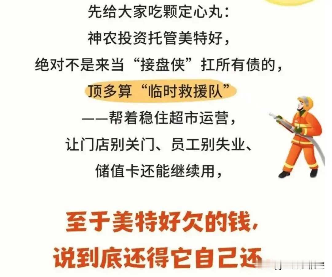 美特好生死局:32年老店破产重整,12亿储值卡能活吗? “当潮水退去,才知道谁在裸泳。” 2026年1月25日,太原中院一纸裁定,把扎根山西32年的美特好推上了破产重整的审判台。 这个曾让山西人骄傲的本土零售巨头,终究没扛住这场惊天危机。 巅峰时,它是太原人逢年过节囤货的首选,2024年年销82.93亿元,全省布局129家门店,妥妥的山西商超一哥。 可如今,它跌得猝不及防: ✅ 2025年10月,无预告闭店14家,引爆11-12亿元储值卡挤兑潮,单日刷卡峰值近2000万元 ✅ 货架被抢空,供应商被拖欠千万货款,数千员工愁丢饭碗 ✅ 董事长亲口承认:挪用储值卡资金投物流,踩碎了山西人的信任 好在,美特好没坐以待毙,山西政企联手打出了闪电自救拳,36天敲定府院联动预重整: ✅ 省属国资神农投资火速托管,实控人为山西省国资委,注入3000万应急资金 ✅ 更名「神农美特好」,2026年1月25日首批15家门店焕新开业,优先录用原员工 ✅ 储值卡新规落地:每笔消费50%抵扣,债权人需在3月31日前申报债权 ⚠️ 划重点:神农投资不是接盘侠! 国资只负责托管运营,美特好的债务、储值卡欠款,终究要自己扛。 这是一场赌上山西本土零售颜面的绝地反击。 一边是盒马、山姆等新零售的步步紧逼,一边是12亿的债务大山和破碎的消费者信任。 美特好,这个承载了山西人32年烟火气的老牌商超,能借着国资东风逆风翱翔,重铸辉煌吗? 还是会在时代浪潮里,彻底坠落深渊?美特好