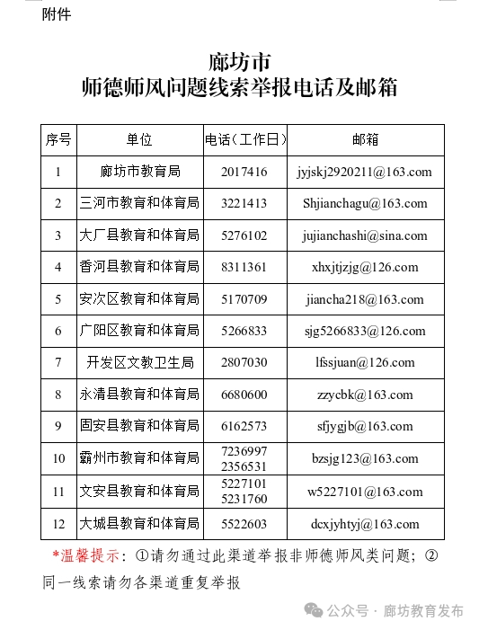 2026年寒假将至,为进一步加强我市师德师风建设工作,规范在职中小学教师从教行为,杜绝在职教师有偿补课问题,营造风清气正的育人环境,现将廊坊市师德师风问题线索举报电话及邮箱公布如下,欢迎广大学生家长和社会各界监督、举报。