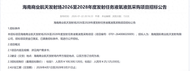近日,海南国际商业航天发射有限公司(简称“海南商发”)公开发布了海南商业航天发射场2026至2028年度发射任务液氧液氮、氦气以及液态甲烷采购项目招标公告。