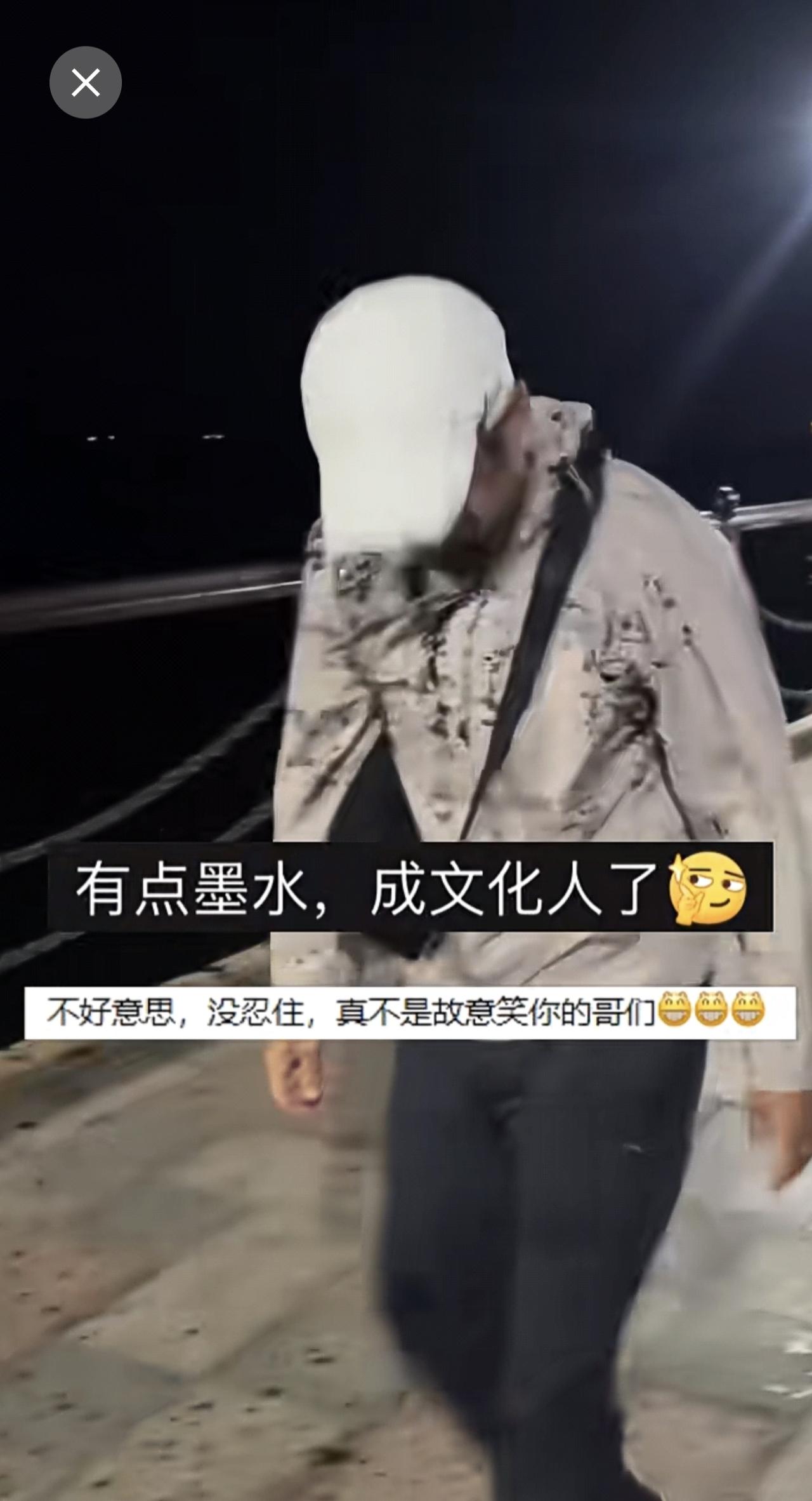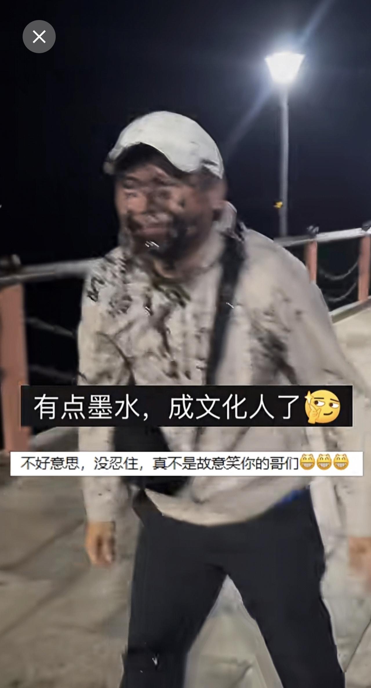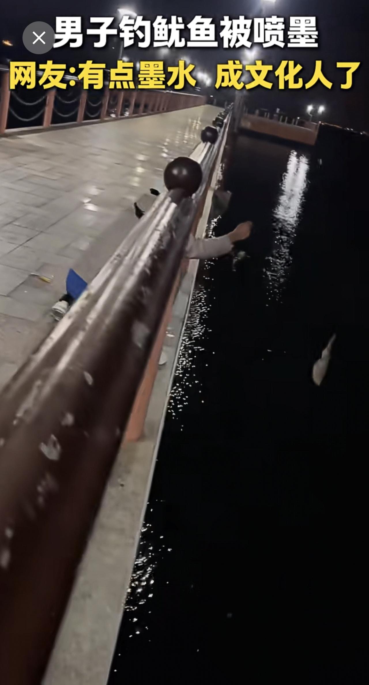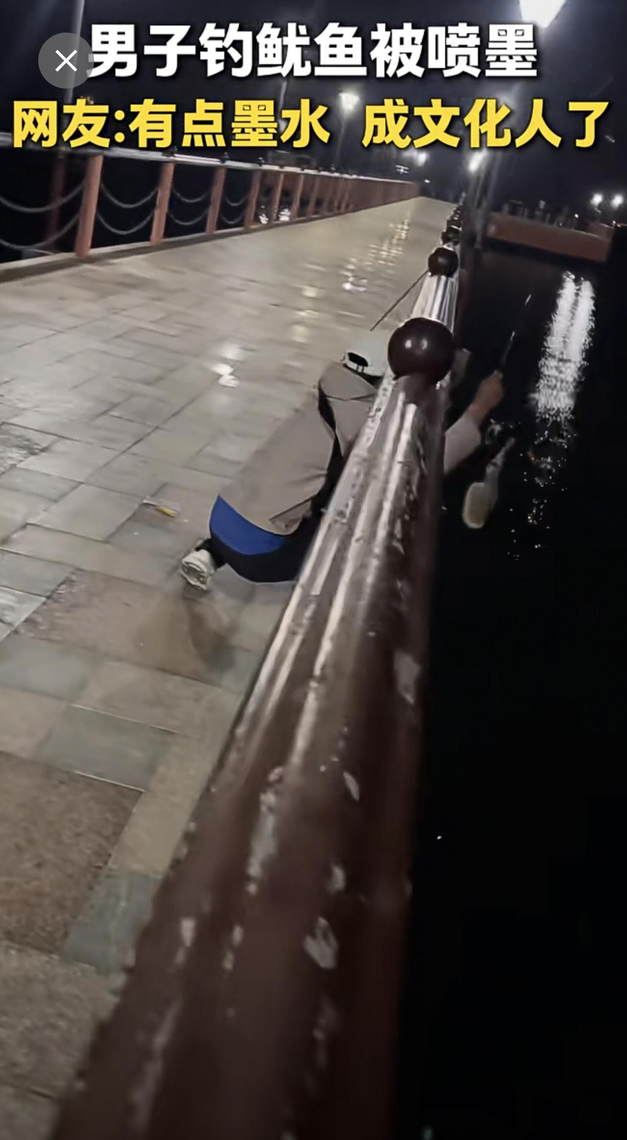 男子钓鱿鱼开心收杆时被喷一身墨汁。网友:回家吃鱿鱼免去了去墨的步骤。