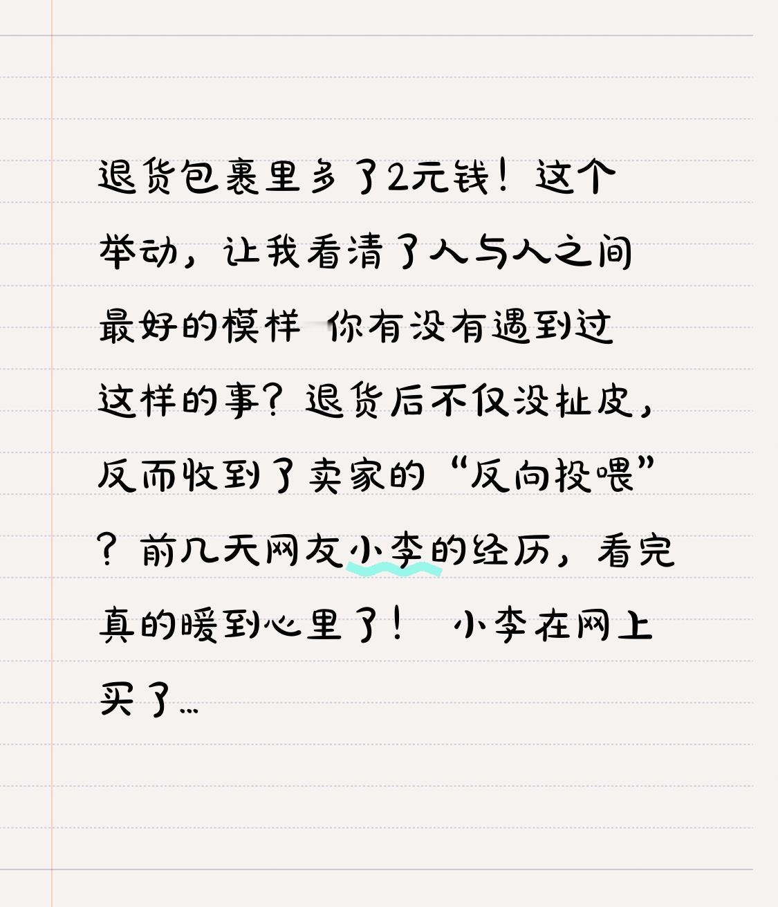 退货包裹里多了2元钱!这个举动,让我看清了人与人之间最好的模样 你有没有遇到过这样的事?退货后不仅没扯皮,反而收到了卖家的“反向投喂”?前几天网友小李的经历,看完真的暖到心里了! 小李在网上买了双帆布鞋,收到后发现鞋码偏小,走路挤脚,想着退换货又嫌麻烦,纠结半天还是发起了退货申请。本以为会像往常一样,要么遇到卖家追问“是不是故意找茬”,要么就是冷冰冰的自动同意,全程没一句多余的话。 打包包裹时,她有点不好意思,毕竟鞋子试穿时踩了点灰尘,虽然不影响二次销售,但总觉得有点对不住卖家。可没想到,退货寄出后没几天,她突然收到卖家的私信:“亲,包裹收到啦,鞋子没问题~ 另外给你退了2元运费补偿,麻烦你跑一趟快递点啦!” 小李当时就懵了,自己明明没付运费险,也没要求卖家承担运费,怎么还多收到2元钱?更让她意外的是,打开退款页面一看,除了货款,真的多了2元转账,备注里写着“辛苦跑一趟,一点小心意”。 她突然想起,自己退货时为了省几块钱,没选上门取件,而是顶着大太阳步行20分钟到快递点。这么小的细节,竟然被卖家注意到了!原来卖家收到包裹后,看到鞋盒干净、鞋子只是轻微试穿痕迹,知道买家不是恶意退货,反而体谅她跑快递点的辛苦,主动加了2元补偿。 小李说,这2块钱真的不多,够买一瓶矿泉水,可心里的暖意却翻江倒海。比起那些因为一点小事就斤斤计较、甚至恶语相向的商家,这个卖家的做法太戳人了。我们总说“尊重”,可尊重到底是什么?不是惊天动地的大事,就是这种“我懂你的不易,也愿意为你的体谅买单”的细节。 想想平时网购,多少人因为退货和卖家吵得不可开交?买家觉得“货不对板就该退”,卖家担心“恶意退货亏成本”,互相提防、彼此消耗。可这个卖家却用2元钱,打破了这种对立:你体谅我做生意的不易,我心疼你跑快递的辛苦,双向奔赴的善意,才是最好的相处模式。 这2元钱,退的不是运费,是理解;送的不是补偿,是尊重。它让我们明白,人与人之间的信任,从来都不是凭空而来的,而是藏在这些不起眼的小事里。卖家多花2元,收获了一个忠实顾客;买家感受到尊重,也会更体谅商家。 其实生活里的温暖,往往就是这么简单。一句体谅的话、一个包容的举动、甚至是这微不足道的2元钱,都能让这个世界变得更温柔。愿我们都能做那个懂得尊重别人的人,也能被这个世界温柔以待。如果你也遇到过这样的暖心瞬间,欢迎在评论区分享~