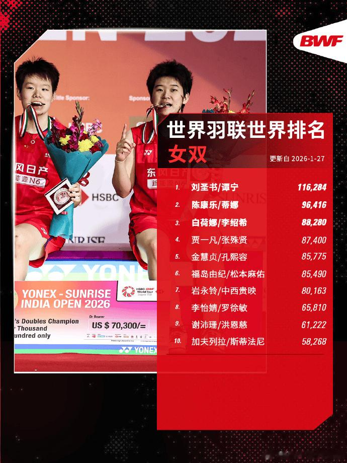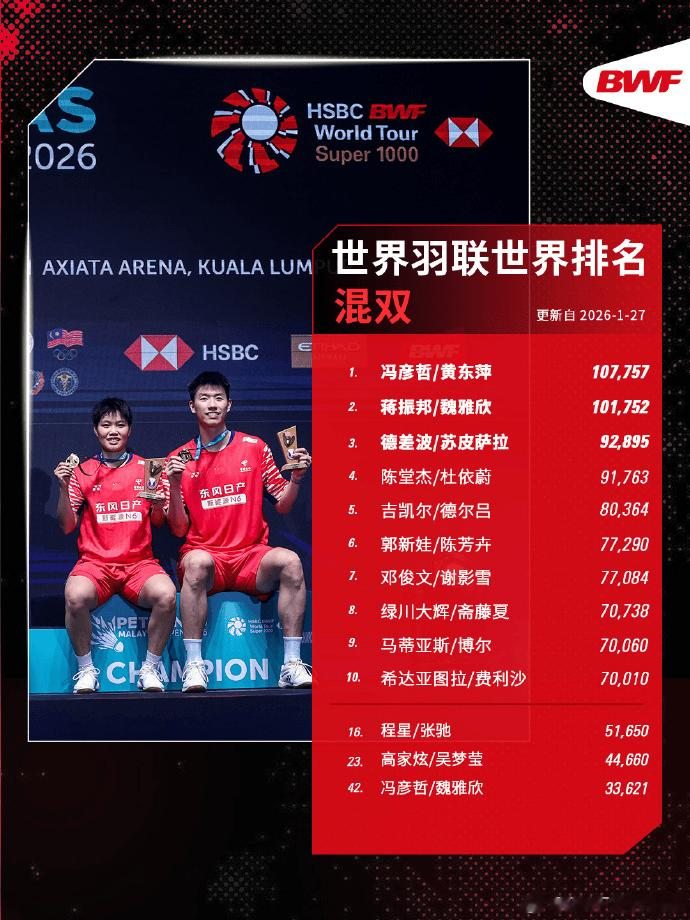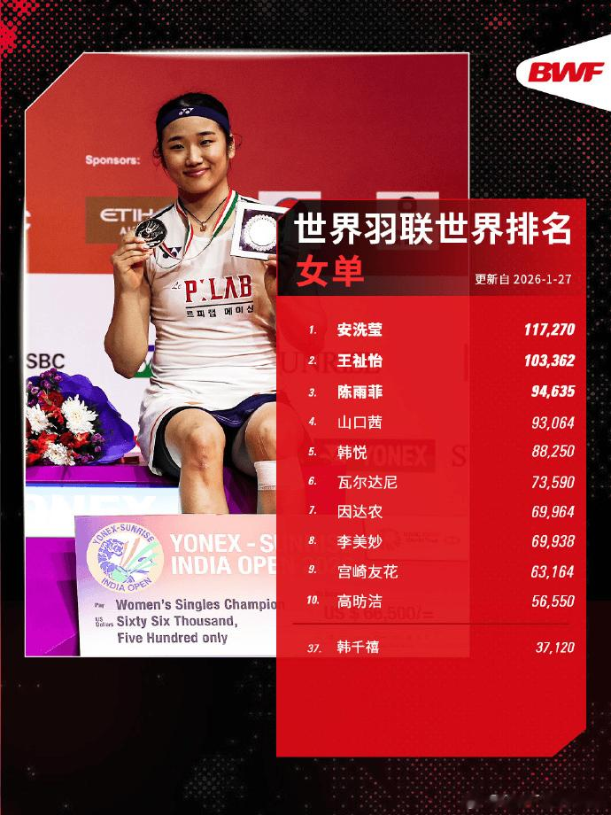 虎扑01月27日讯世界羽联公布2026年第5周世界排名,刚在印尼羽毛球大师赛夺冠的陈雨菲上升一位,来到世界第三。