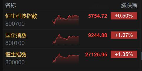 格隆汇1月27日|港股三大指数集体收涨,恒生科技指数一度冲高至1.6%,最终收涨1.35%重新站上27000点,国企指数涨1.07%,恒生科技指数涨0.5%。