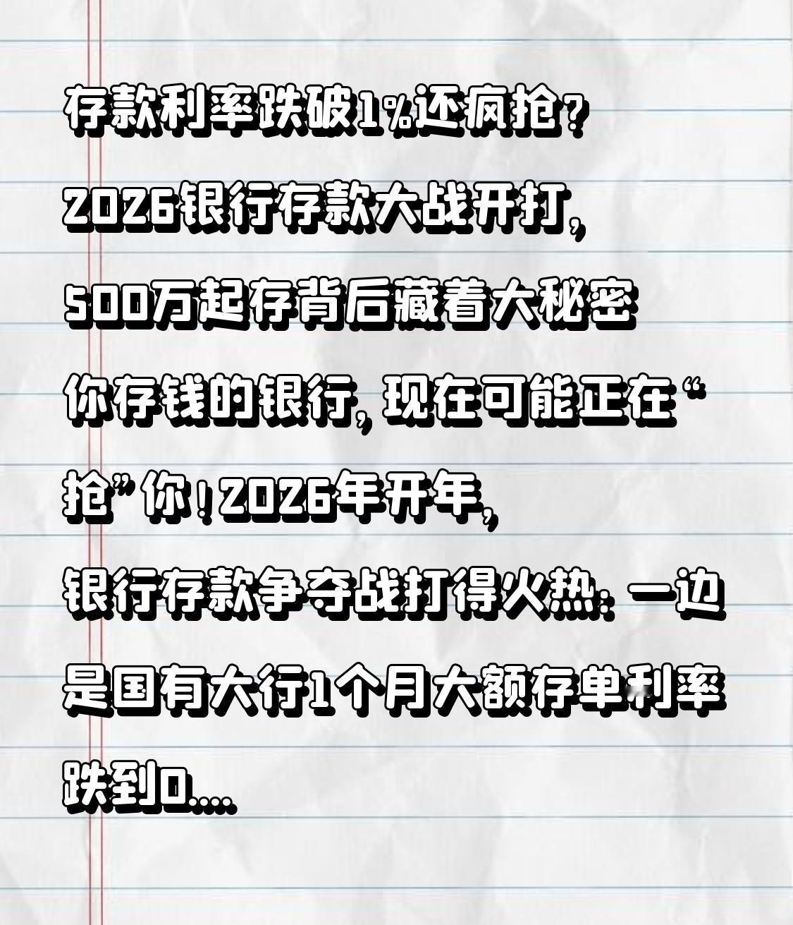 存款利率跌破1%还疯抢?2026银行存款大战开打,500万起存背后藏着大秘密 你存钱的银行,现在可能正在“抢”你!2026年开年,银行存款争夺战打得火热:一边是国有大行1个月大额存单利率跌到0.9%,存20万三个月利息才450元;一边是百万起存的高端存单被秒空,中小银行还在逆势加息,这波操作到底是怎么回事? 前几天张阿姨去银行存钱,直接被柜台经理拦住:“阿姨别存普通定期,试试我们的资产提升活动,存够100万,三个月能换72万小豆,能兑上千块的米面油和购物卡!”张阿姨一算,虽然利率才1.55%,但加上权益,比普通存款划算不少,果断把其他银行的钱转了过来。 可另一边,刚工作的小李就没这么幸运了。他想存5万短期存款,跑了三家国有大行,发现1年期利率最高才1.2%,5年期产品直接下架了。更离谱的是,工商银行一款3年期利率1.55%的产品,起存门槛竟然要100万,农业银行甚至推出500万起存的大额存单,普通储户根本够不上。 这就是2026年银行存款大战的真实写照:国有大行和中小银行彻底“分道扬镳”。大行这边,净息差跌到1.42%的历史低位,干脆放弃了高息揽储,转而搞“资产提升战”——工商银行送工银i豆,中国银行抽600万积分,农业银行的小豆能换京东E卡、外卖红包,本质上是用权益绑定客户的全部资产,而不是单纯吸存款。 而中小银行压力更大,只能逆势加息抢客户。河南、湖北、山西的多家农商行,把1年期利率上调到1.55%左右,吉林银行3年期利率冲到2%,还有银行搞“短降长升”,特意提高2-5年期存款利率。可就算这样,和几年前比还是差远了,2025年9月起,银行定期存款利率就全线跌破2%,现在能找到1.8%以上的产品都算“高息”。 更让人看不懂的是“高门槛稀缺化”。以前20万就能买的大额存单,现在大行直接分成了“普通款”和“高端款”,100万、500万起存的产品利率稍高还秒售罄。专家说,这是银行在筛选客户,用有限的高息额度留住有钱人,既降低管理成本,又能锁定优质资产。 可咱们普通老百姓该怎么办?存大行,利率低但安全;存中小行,利率稍高但要选正规机构;想多拿收益,还得琢磨银行的权益活动,算清楚积分、小豆的实际价值。关键是要明白,2026年存款利率低位运行是常态,5年期大额存单几乎绝迹,靠存款暴富不现实,稳健配置才是王道。 其实银行这场“战争”,本质是利率市场化的必然结果。对我们来说,不用盲目追高息,也不用纠结利率高低,根据自己的资金情况选对产品最重要:短期用的钱存活期或货币基金,长期不用的钱可以选中小行正规定期,或者搭配低风险理财。 钱是咱们辛辛苦苦赚来的,怎么存、存哪里,得心里有数。愿大家都能在这场存款大战中,找到适合自己的“稳赚”方式,让每一分钱都能发挥最大价值。你现在的存款利率是多少?评论区聊聊你的存钱妙招~