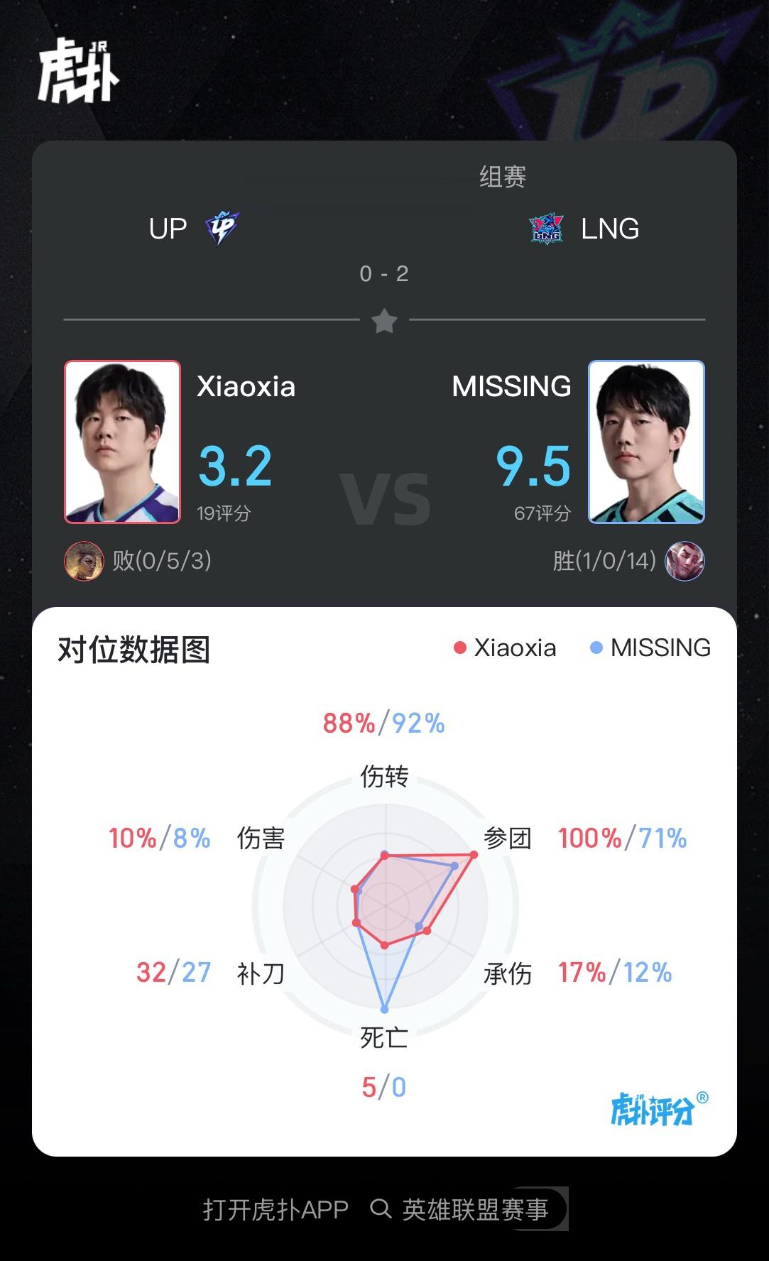 虎扑01月27日讯在刚刚结束的LNG对阵UP的对局中,Missing使用洛打出1/0/14战绩,斩获LNG对阵UP第二局MVP
