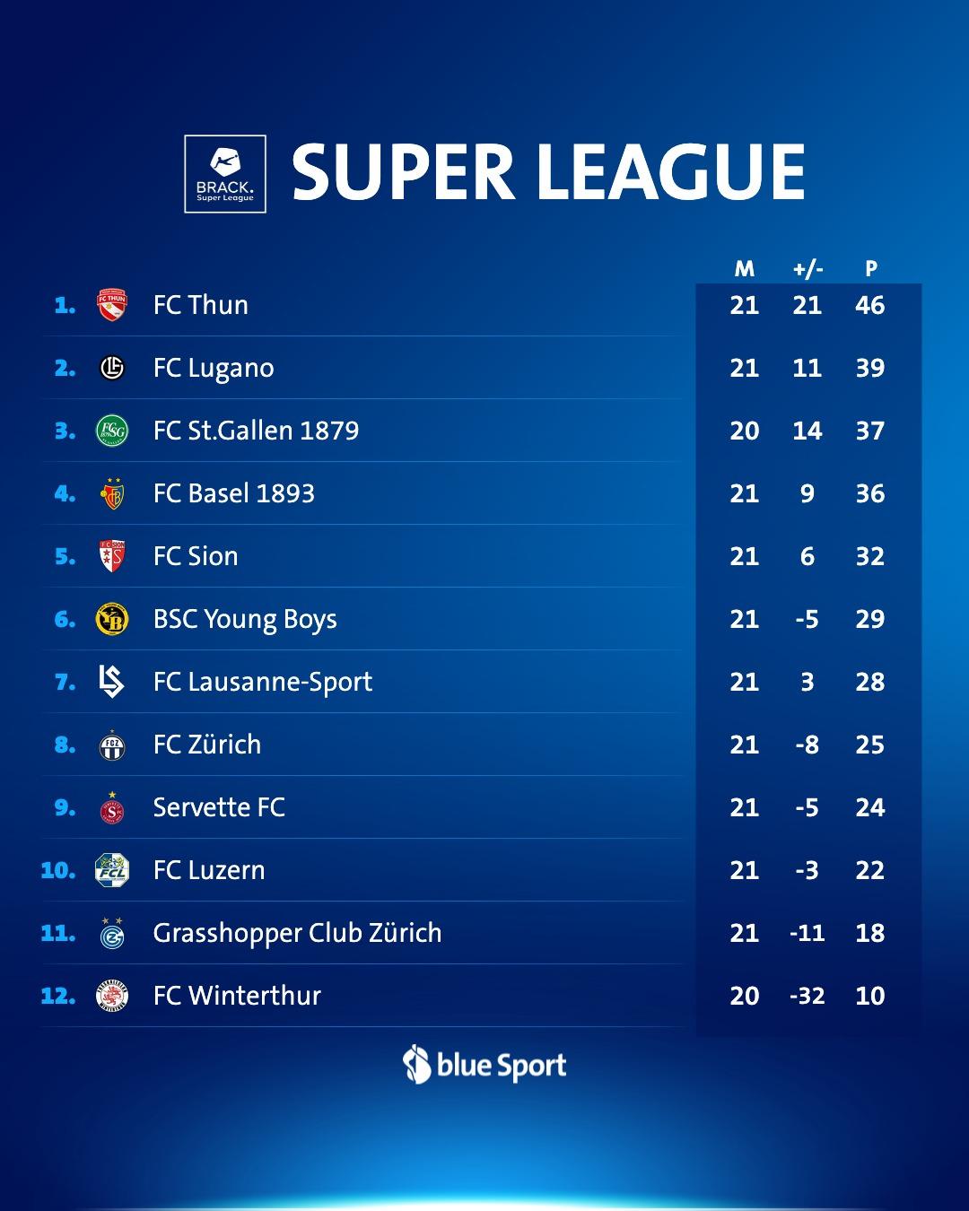 瑞士超升班马7分领跑 1月25日,瑞士超级联赛第21轮,领头羊图恩4-1击败年轻人,以7分优势领先第二名卢加诺。 作为升班马,图恩在其127年的历史中,从未赢得过任何重要奖杯,仅在2009-10赛季和2024-25赛季拿到瑞士挑战联赛(二级)冠军。