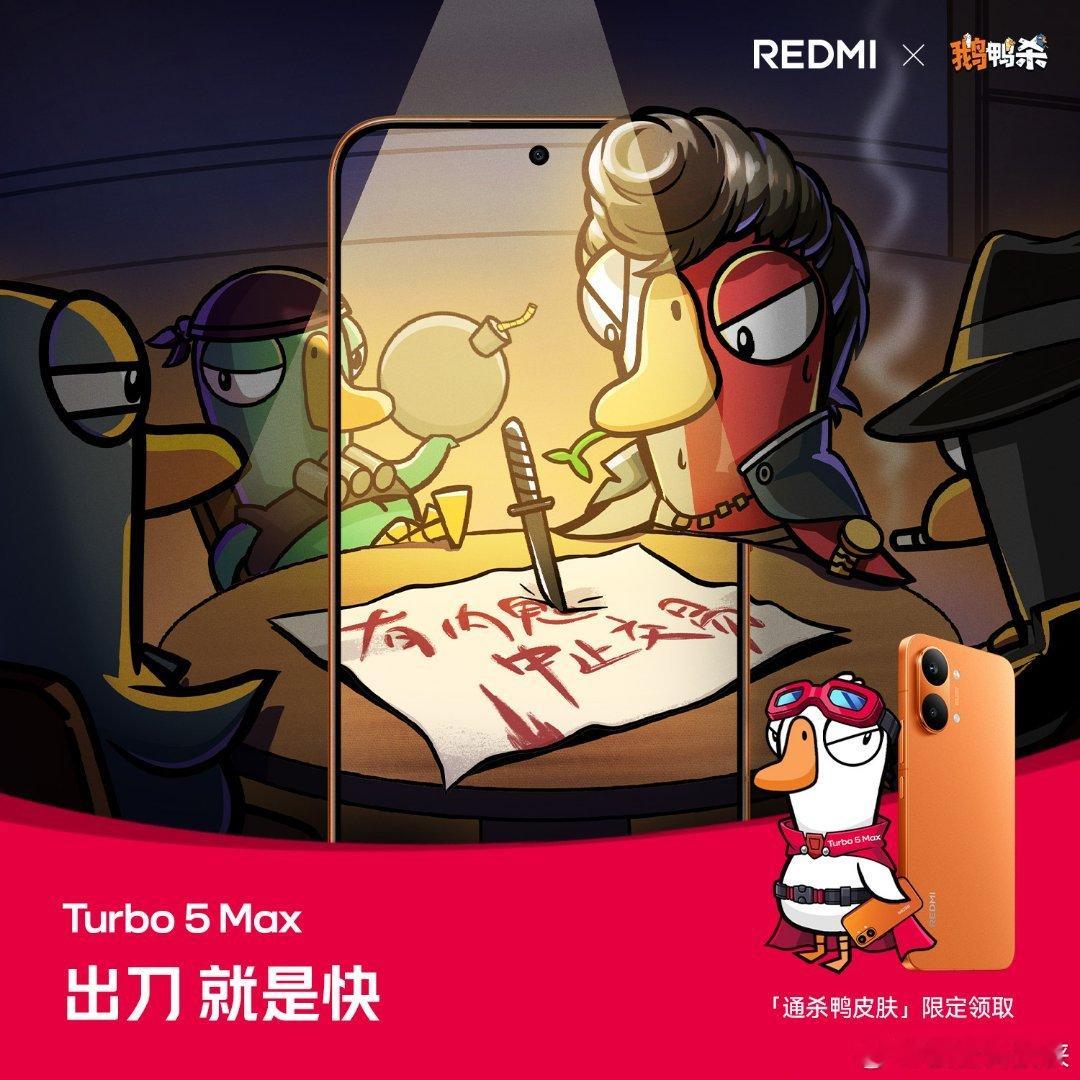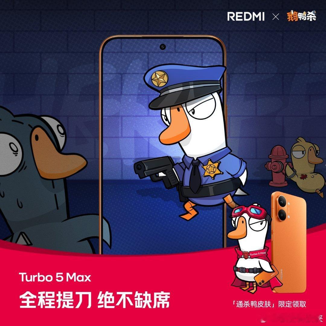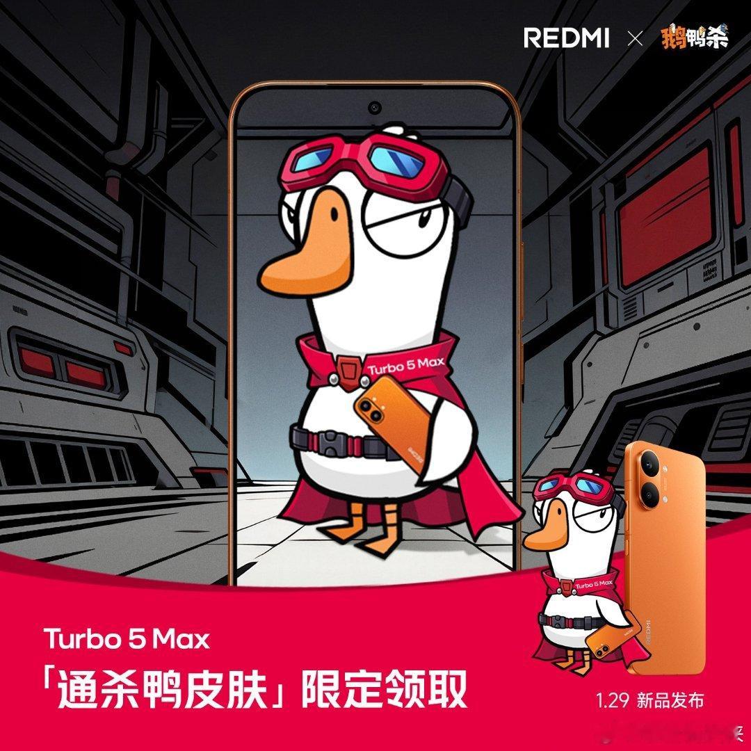 快看!用 Turbo 5 Max 组局鹅鸭杀妥妥杀两天,出刀就是快!全国 2000 家小米之家 1.27-1.29 限量领取「通杀鸭」皮肤周四晚 7 点,Turbo 5 系列新品发布!Turbo5MaxREDMI