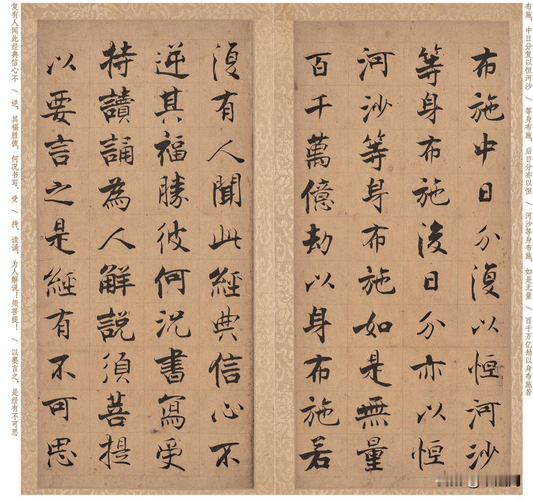美国秘藏的南宋《金刚经》真迹!5100多字无一缺损,市场估值高达10亿! 我们都知道北宋有书法“四大家”之说,即苏轼、黄庭坚、米芾和蔡襄,而在南宋也有“四大家”,他们是张即之、陆游、朱熹和范成大。这八位书家中,要说楷书和大字水平谁居魁首,则当属张即之了,他被誉为“大字战神”“宋书殿军”,真迹被中外各国当作“国宝”。 在美国普林斯顿大学博物馆,珍藏着张即之晚年所书的一部《金刚经》,全卷完完整整,保存得非常好。此作为纸本册页,共66折、132页,每页纵约33.5厘米、横约17.1厘米,总长度超过了20米,单字大小约3厘米,以楷书写就。 笔法上,此作以“锐利露锋、方折生骨”为核心,他深耕柳公权笔法精髓,得柳骨而化其形,起笔多采用凌厉切锋,行笔中提按对比强烈,笔画粗细变化鲜明,收笔或果断驻锋,或迅疾出锋,精准掌控笔锋态势。 转折处顿笔蓄力后折锋下行,形成方硬折角,摒弃了宋代文人书法常见的圆转柔媚习气,每一笔都充满力量感。捺画至捺脚处重按后猛然提出,形成张力十足的三角形波磔,成为张体楷书的标志性笔法。 结字险中求稳,欹侧多变,中宫紧收,主笔舒展,整体呈现左低右高、左重右轻的态势。这种结字方式既需要极高的空间感知能力,又依托扎实的法度根基,既避免了呆板,又不流于怪异,尽显“奇而不怪”的艺术境界。 全卷字距紧密而行距疏朗,行气贯通,既保持了庄严感,又通过笔势呼应、墨色变化赋予作品灵动韵律。墨色以浓墨为主,偶用淡墨调剂节奏,无涨墨、渴笔之弊,鲜活度历经近八百年仍未衰减。 五千余字自始至终风格统一、水准稳定,足见张即之书写时的情绪控制力与技法熟练度,达到了“随心所欲不逾矩”的境界。 启功盛赞:“笔法险劲,结体精严,犹存唐人遗矩。楷书至此,以为尽也!”精准点出其承唐启后的价值。元代虞集指出其“得柳诚悬之骨而化其形”,明代安世凤称其“如屈铁错金,观之令人心魄震撼”。 此作流传脉络清晰,曾入藏宋理宗御府,经明代项元汴等收藏家递藏,1951年被普林斯顿大学博物馆以10万美元购藏,现为该馆亚洲艺术展厅镇馆之宝,市场估值已高达10亿。 对当代学书者而言,临摹此作既能习得唐宋人楷法根基,又能借鉴其方劲笔法与奇崛结字,丰富技法储备、提升笔力控制,有效突破楷书用笔呆板的瓶颈,真正理解“法度与个性相融”的书写要义。 我们将此作进行了博物馆级的超高清12色微喷复制,并添加释文一一对应,便于您临摹和欣赏。