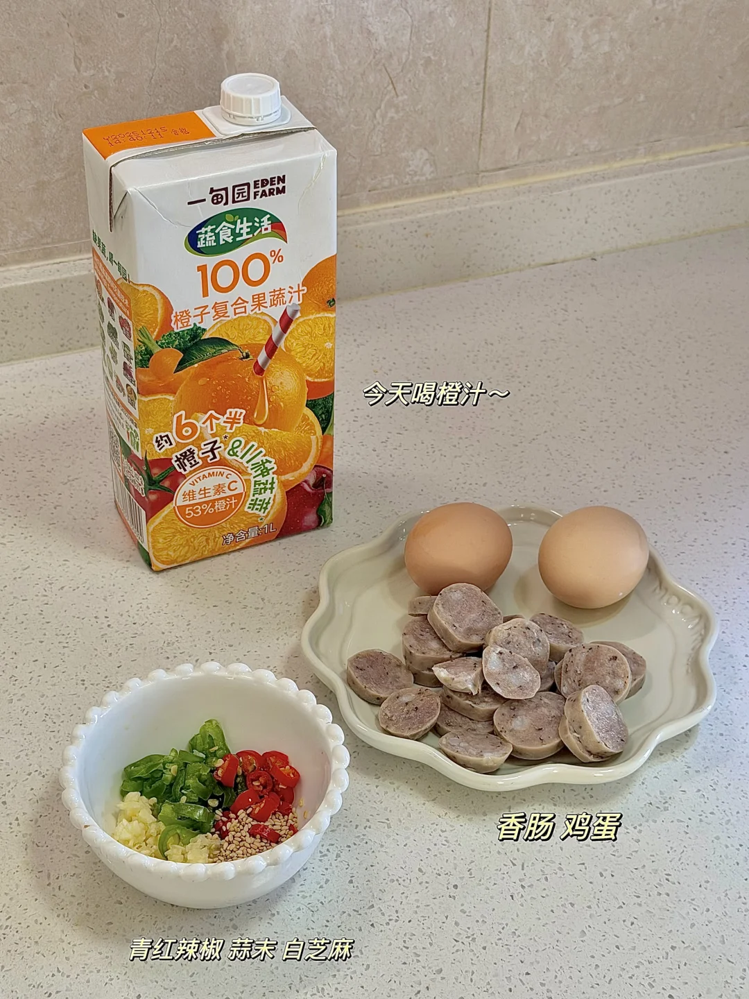 今日份一人食健康餐分享: 香肠煎蛋盖饭 一杯橙子复合果蔬汁 . 配料:香肠 鸡蛋 青红辣椒 蒜末 白芝麻 做法如图上⬆️ . 好久没吃香肠煎蛋盖饭了,今天安排上~ 在搭配一杯姐妹送的新年礼物~一甸园100%果蔬汁缤纷礼盒 今天喝的是橙子复合果蔬汁~好浓郁,好喝 . 礼盒里面有5种口味: 100%苹果汁、葡萄汁、小青柠、橙汁、橙子复合果蔬汁 配料表贼干净,100%纯果汁,小朋友也可以放心喝 . 马上就春节了,送点健康的给亲戚朋友吧 包装精美又有面,果蔬搭配更健康 老人小孩家庭聚会必不可少~