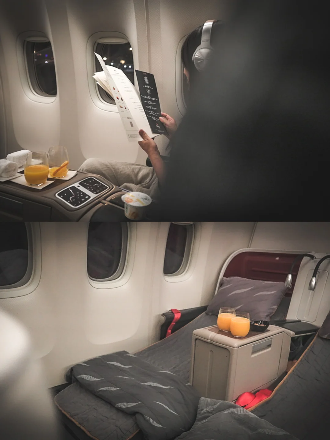 [鼓掌R]起飞后会有空乘帮你铺床,商务舱座椅可一键180度完全平躺,舱内灯光渐暗,营造出静谧的睡眠氛围,可以舒舒服服度过漫长夜晚,醒来时神清气爽,精力充沛地迎接目的地的清晨。