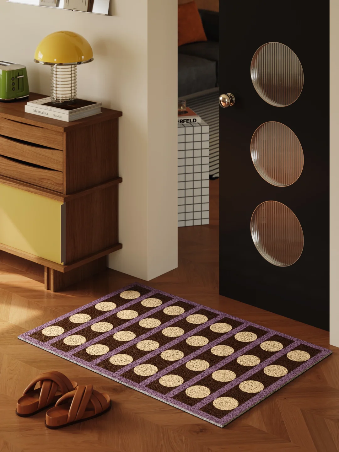 换了这块地垫之后,玄关直接从 “将就” 变 “惊艳” 一开门就是复古感满满的红蓝撞色波点 像把老上海画报和美式复古风揉在了一起 瞬间跌入画报里的小客厅🛋️ 蓝底红波点的配色大胆又和谐 浅米色的包边中和了跳跃感, 跟复古木地板、黑色大理石踢脚线简直是绝配