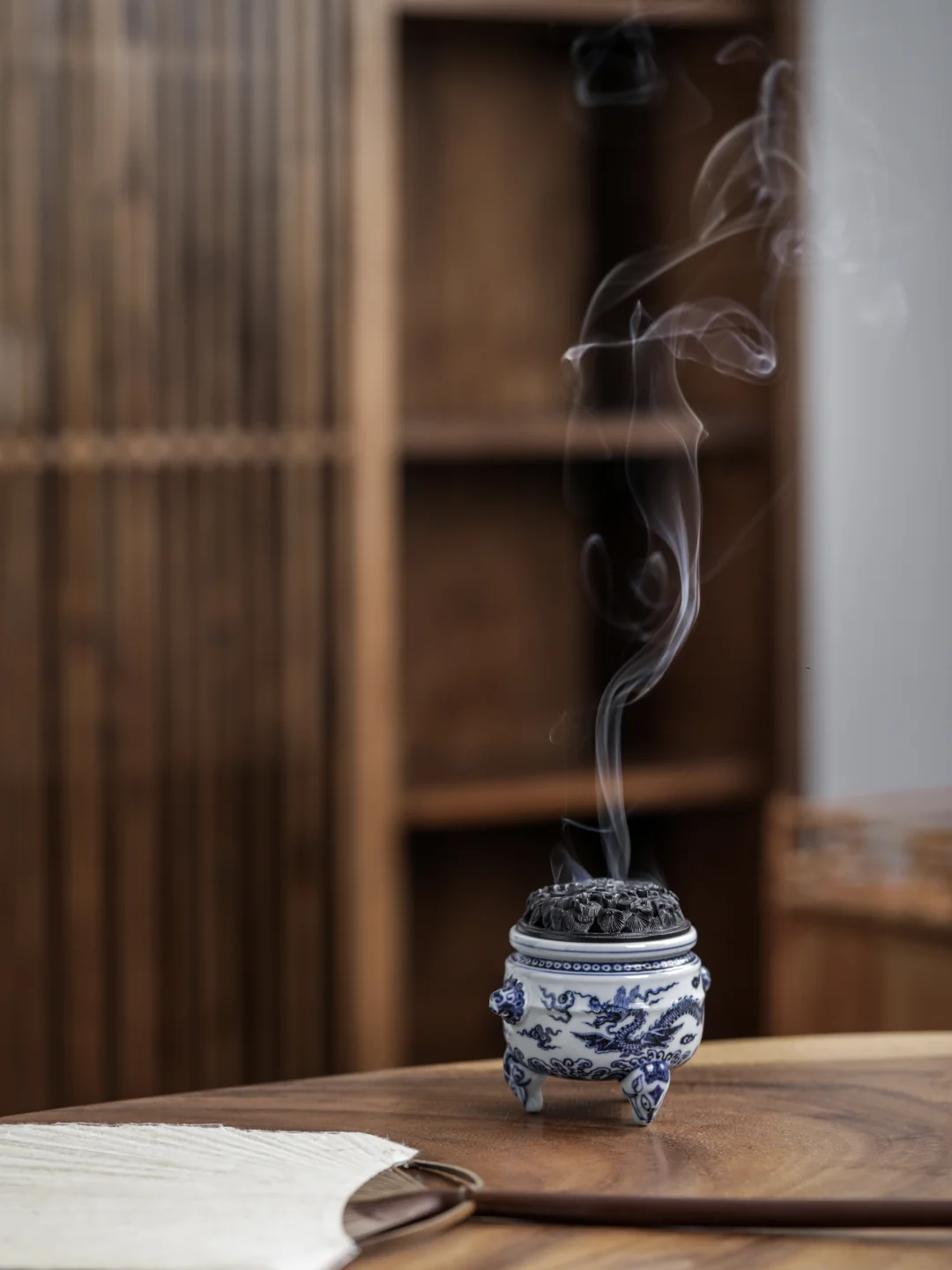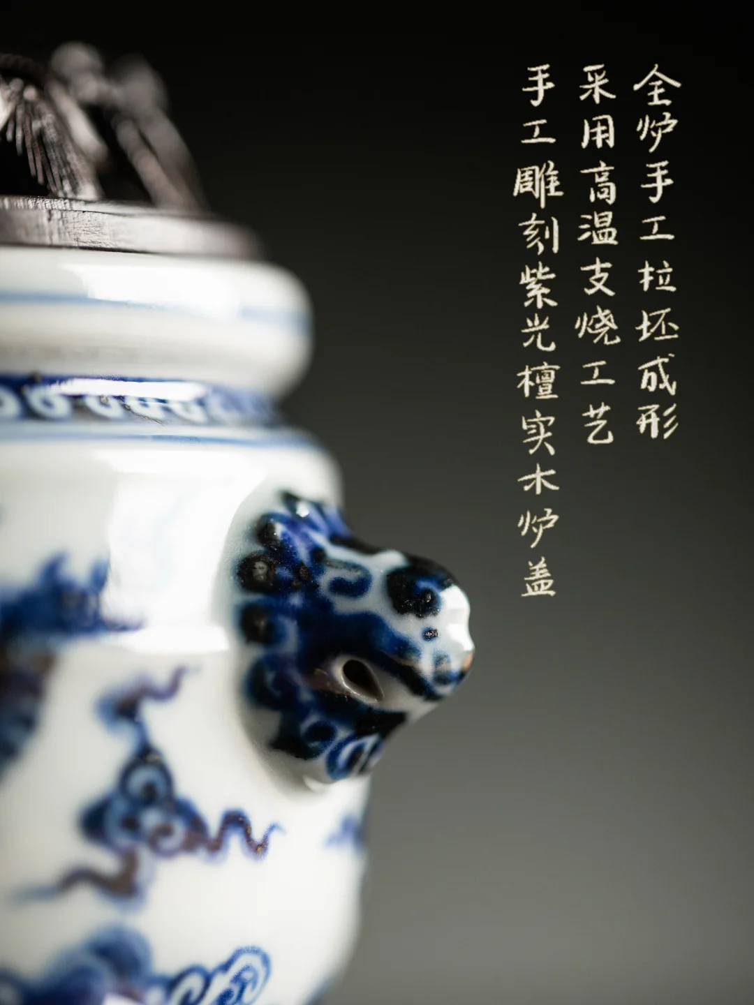 三足为象,寓意“太平有象”。炉身绘永宣龙纹,青花发色沉静。龙象共聚,是国力鼎盛的旧影,亦是对家业宏图的一份期许。