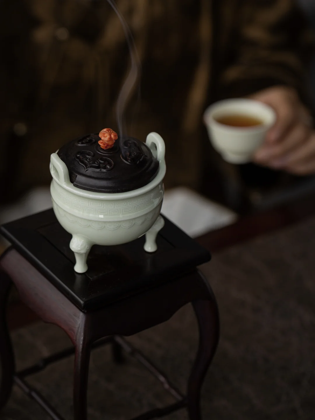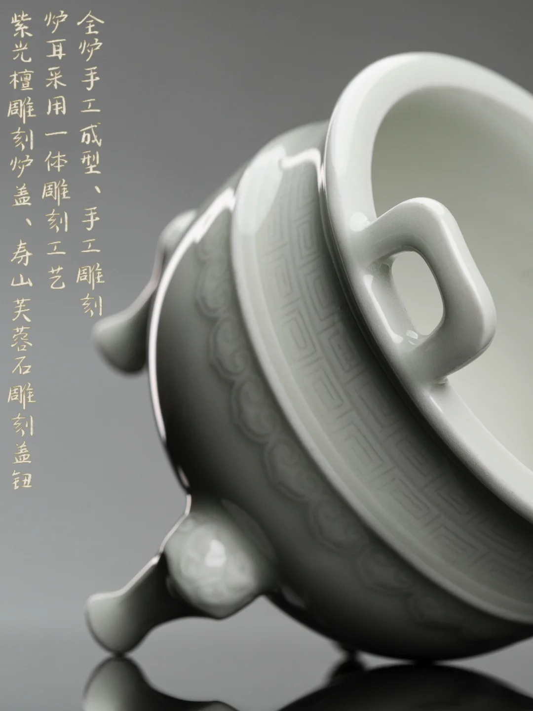 承宋代铜炉风骨,草木灰釉古拙温厚。回纹环刻,寓意绵长不绝。它宛如家宅的基石,静守一室,是安稳的起点。