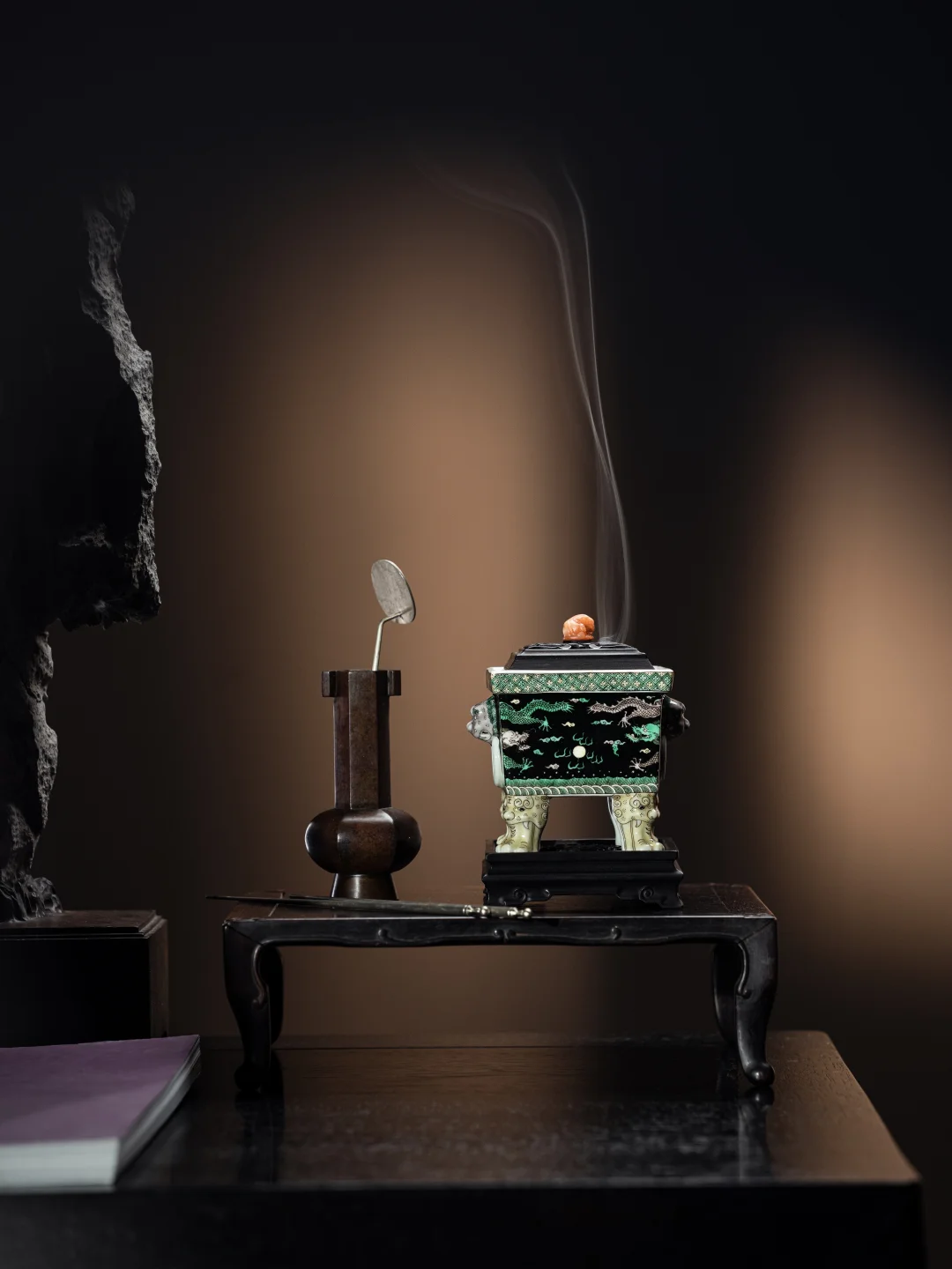 四足狮首,庄重威严。素三彩纹样清雅含蓄,有镇宅之器的分量,亦有文房雅器的清贵,予人四平八稳的安心感。