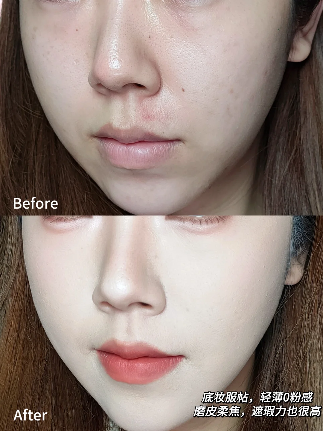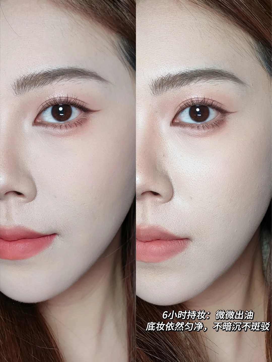 质地做的很细腻,一拍融肤,冬天上脸也不拔干。妆效非常轻薄,社交距离看完全没有粉感,但是遮瑕力很在线,把毛孔痘印修饰的很好!透出的淡淡柔光很像原生皮肤的光泽,自然又高级,持妆6小时微微出油不斑驳反而更贴合了