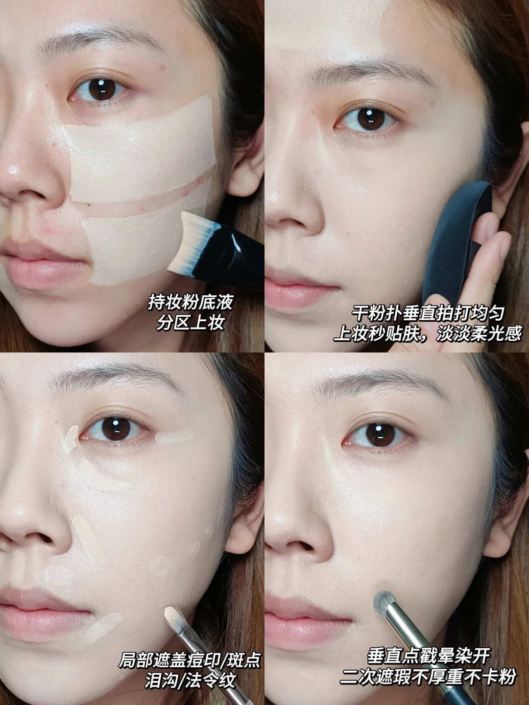 选择足够轻薄又有一定遮瑕的持妆粉底液,记得分区上妆,用干粉扑垂直拍开,贴肤不浮粉,