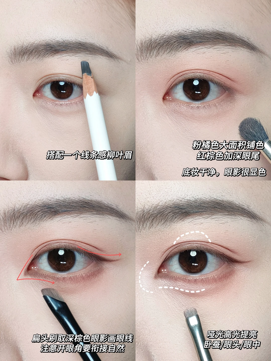 画线条感柳叶眉,粉橘色眼影大面积铺底消肿,红棕色加深眼尾,深棕色眼影画眼线,哑光高光提亮眼头
