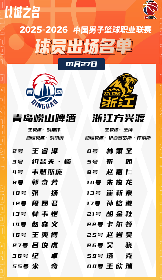 虎扑01月27日讯今晚CBA常规赛,青岛对阵广厦的大名单已经公布。