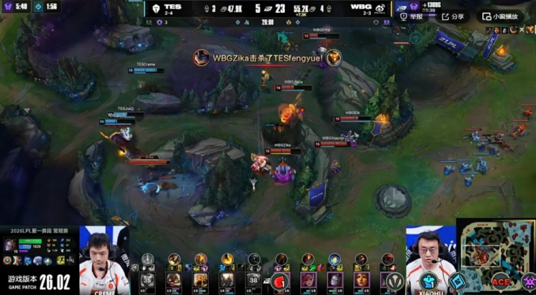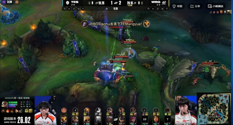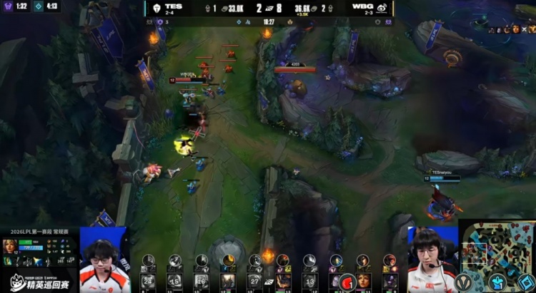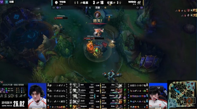 [15:54]Zika兰博交出TP进大龙坑,保护队伍拿到峡谷先锋!随后WBG用先锋强拆上二塔,TES拿下小龙之后河道强开Elk希维尔,但是Fengyue巴德大招乌龙金了自己两个人!Zika兰博+Xiaohu发条救下队友,369安蓓萨进场稍晚,但自己没大反而是直接白给了!这波WBG击杀TES四人!拉开3K经济差!